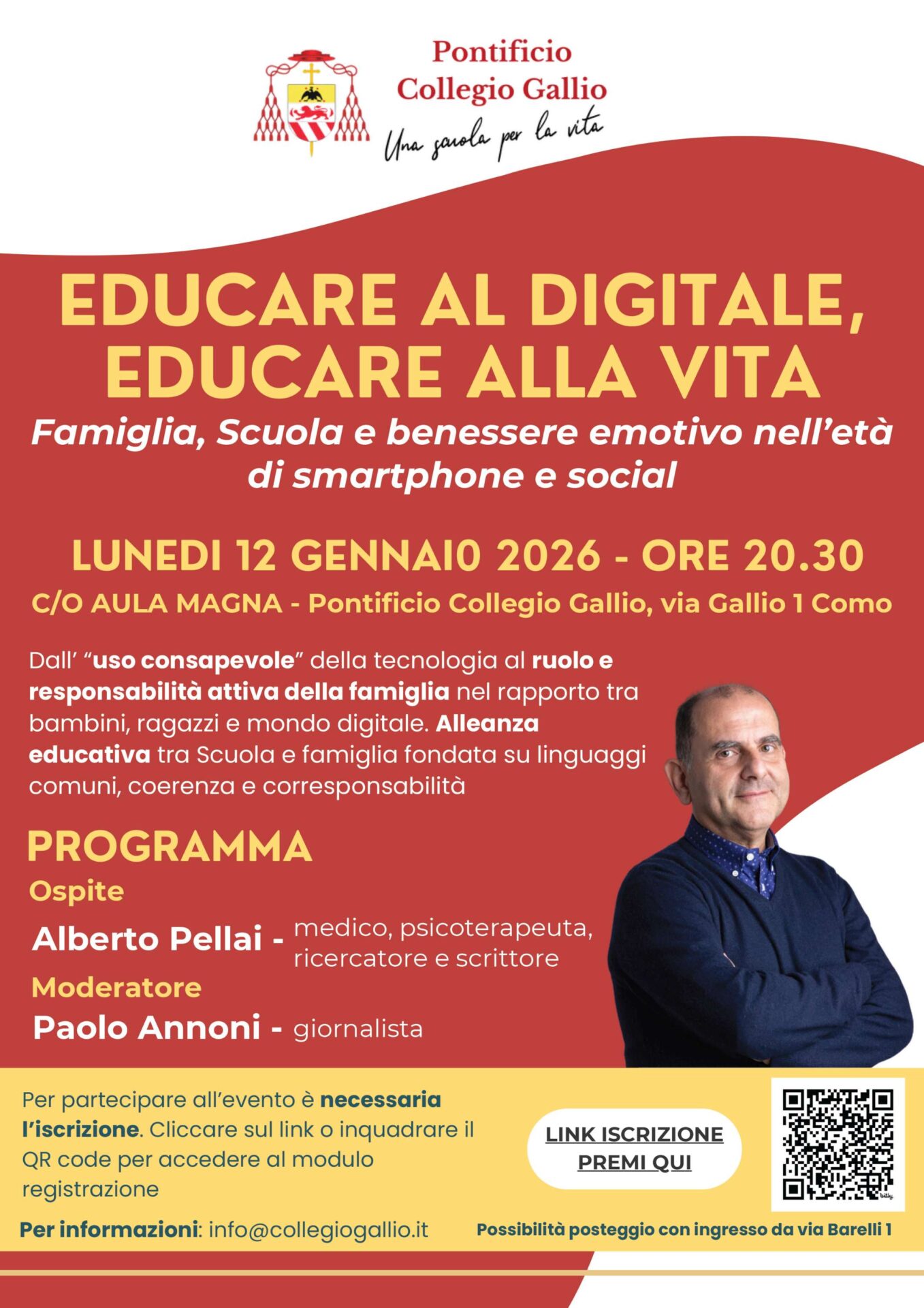 Sarà Alberto Pellai, medico, psicoterapeuta, ricercatore e scrittore, tra le voci più autorevoli del dibattito educativo nazionale, il protagonista della serata promossa dal Pontificio Collegio Gallio di Como dedicata al tema dell’educazione nell’era digitale. L’appuntamento (a ingresso libero ma con iscrizione obbligatoria attraverso questo link diretto https://bit.ly/eventoGallioPellai260112?r=qr o inquadrando il Qr Code inserito nella locandina) è in programma lunedì 12 gennaio 2026 alle ore 20.30 nell’Aula Magna del Collegio.