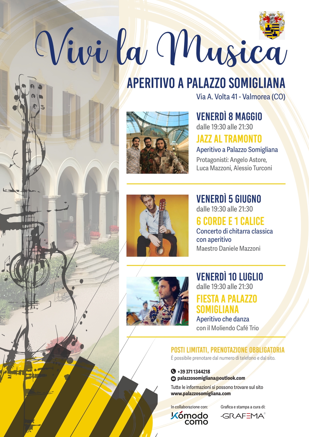 E ora ecco un nuovo progetto: i concerti al tramonto con aperitivo a Palazzo Somigliana, luogo che i proprietari (discendenti di Alessandro Volta), hanno deciso di aprire al pubblico.