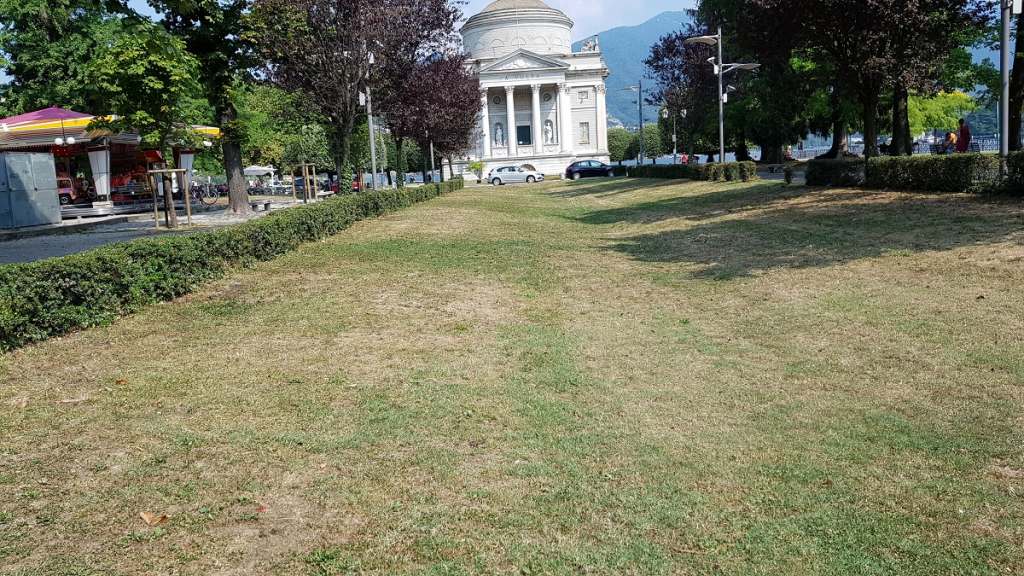 Si presenta davvero male in questa estate 2018 uno dei prospettivi più da cartolina di tutti, a Como. Il lungo viale verde che porta al Tempio, più di tutti gli altri spazi verdi, è molto più simile a un campo brullo che non al nobile tappeto erboso che introduce alla vista del monumento.