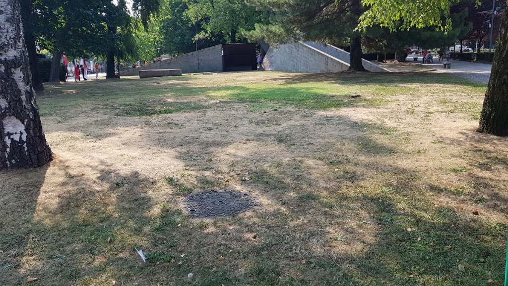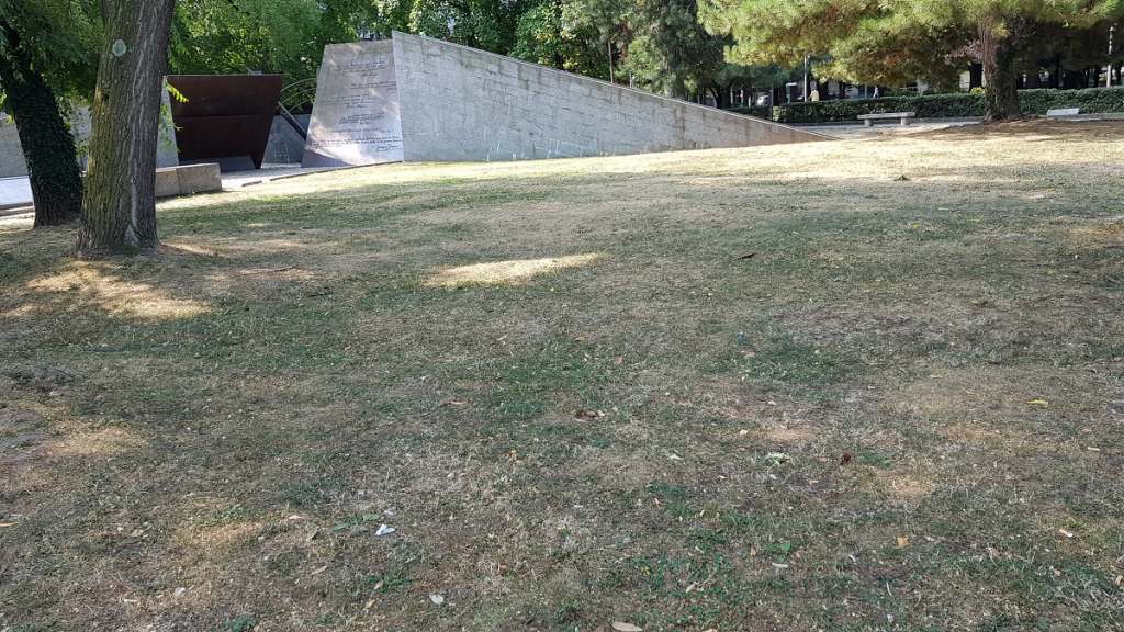 Certamente anche il caldo torrido avrà avuto il suo bel peso, e nel complesso tutto il verde della zona giardini a lago è davvero malconcio. Anzi, in larga parte – attorno al Museo della Resistenza europea, alla scultura raffigurante Mafalda di Savoia e nei dintorni – il verde è assente, bruciato, soffocato da terra aspra e circondato da siepi mancanti di vari “pezzi”.