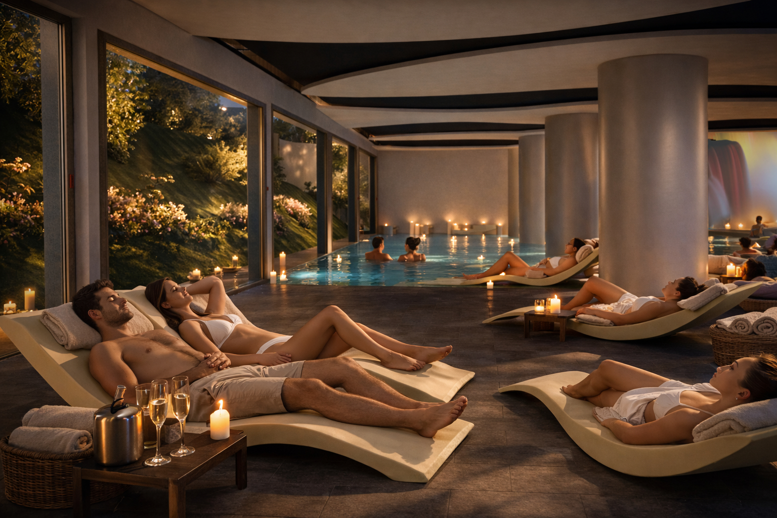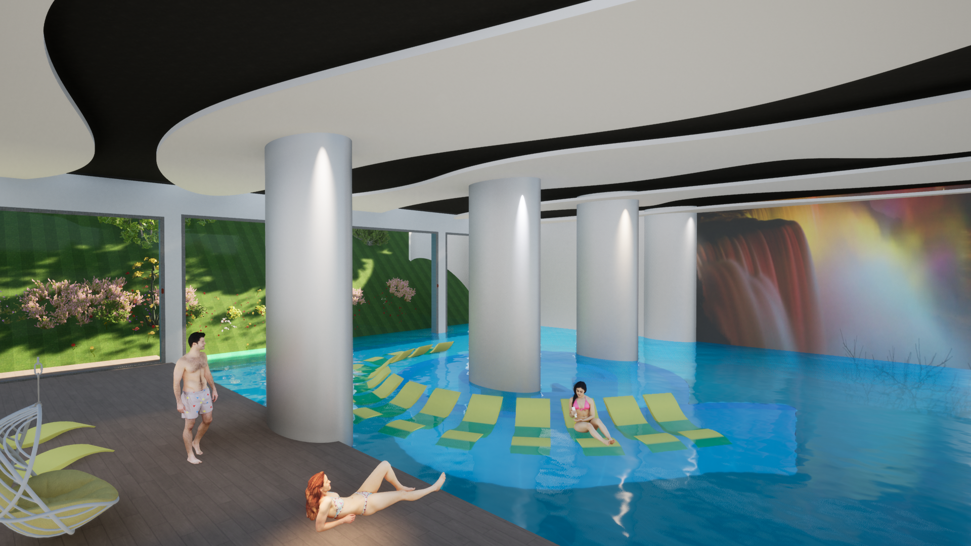 - il centro benessere, che comprende l’area termale con piscina parzialmente emergente verso l’esterno, così da consentire l’ingresso della luce naturale dall’alto, e che si integra con le altre funzioni fitness e con gli spazi commerciali dedicati al benessere situati ai piani superiori.