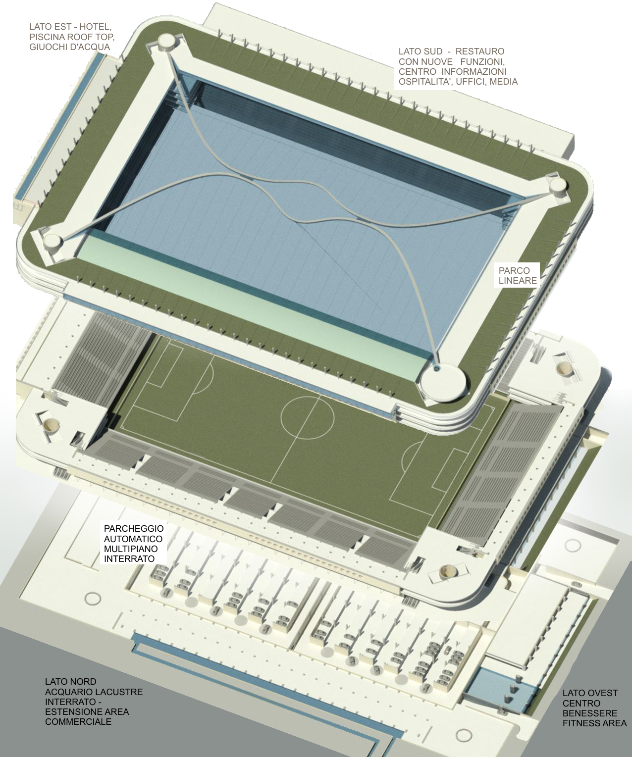 come di consueto mi permetto di allegare un altro step dello stadio Sinigaglia in attesa dell’unveiling del progetto ufficiale, mi permetto di immaginare come potrebbe essere sviluppata la parte interrata, già anticipata nella mia proposta iniziale. In particolare, i render allegati intendono illustrare la configurazione degli spazi interrati, nei quali sono evidenziati: