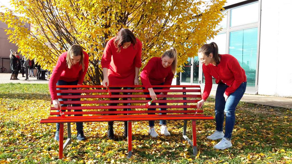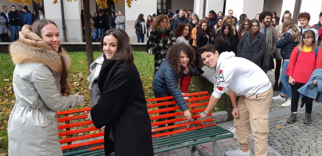 Anche gli studenti dell’Università dell’Insubria, questa mattina, hanno dipinto di rosso una panchina al Chiostro di Sant’Abbondio (oltre a quella del Campus di Bizzozero, a Varese)