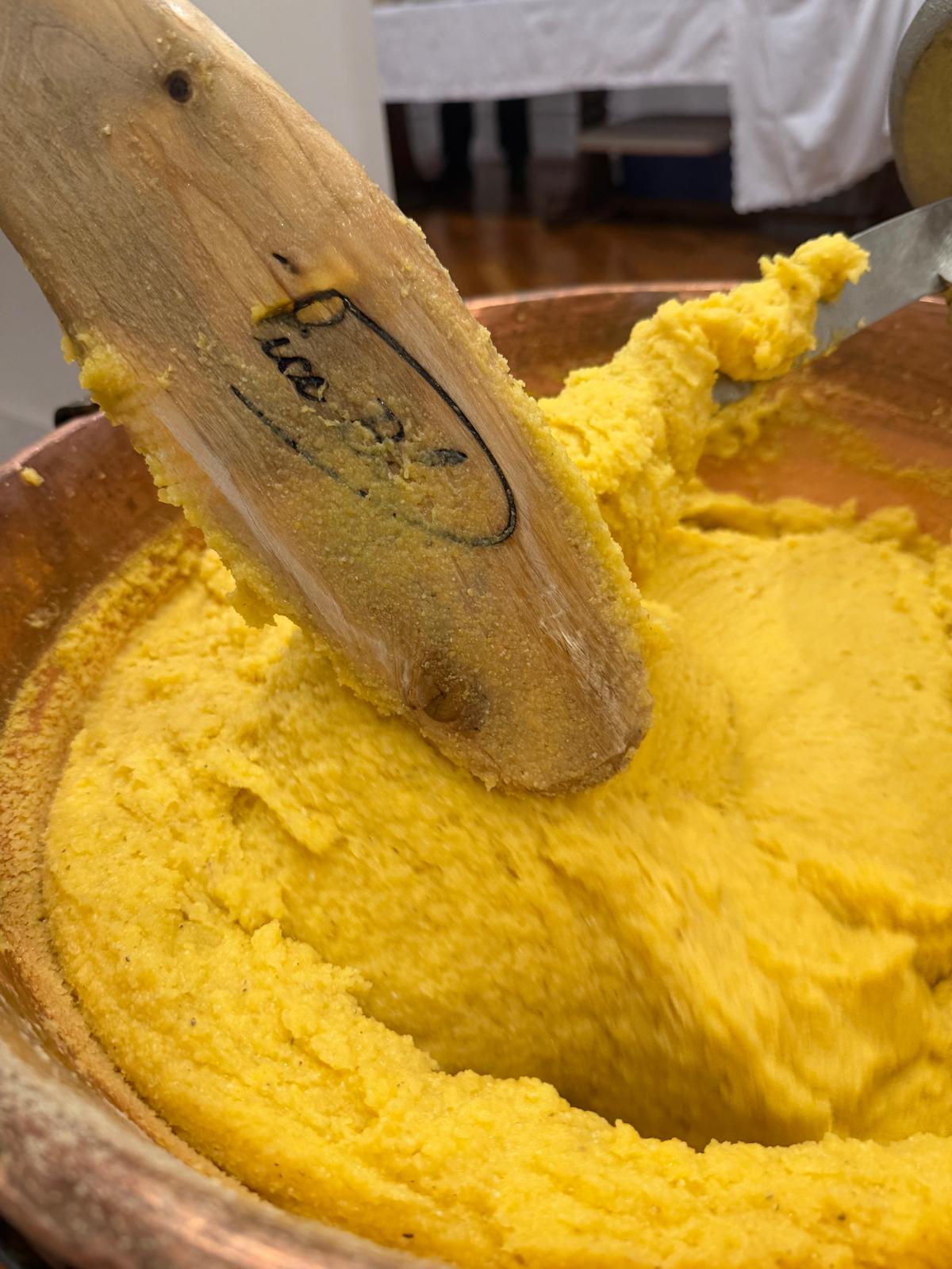 Il toc è il piatto simbolo della cucina bellagina e del Lago di Como. Una polenta ricca, lenta, preparata con pazienza, mescolata a lungo e arricchita con burro e formaggi del territorio, servita tradizionalmente in un paiolo posto al centro della tavola e consumata con le mani.
