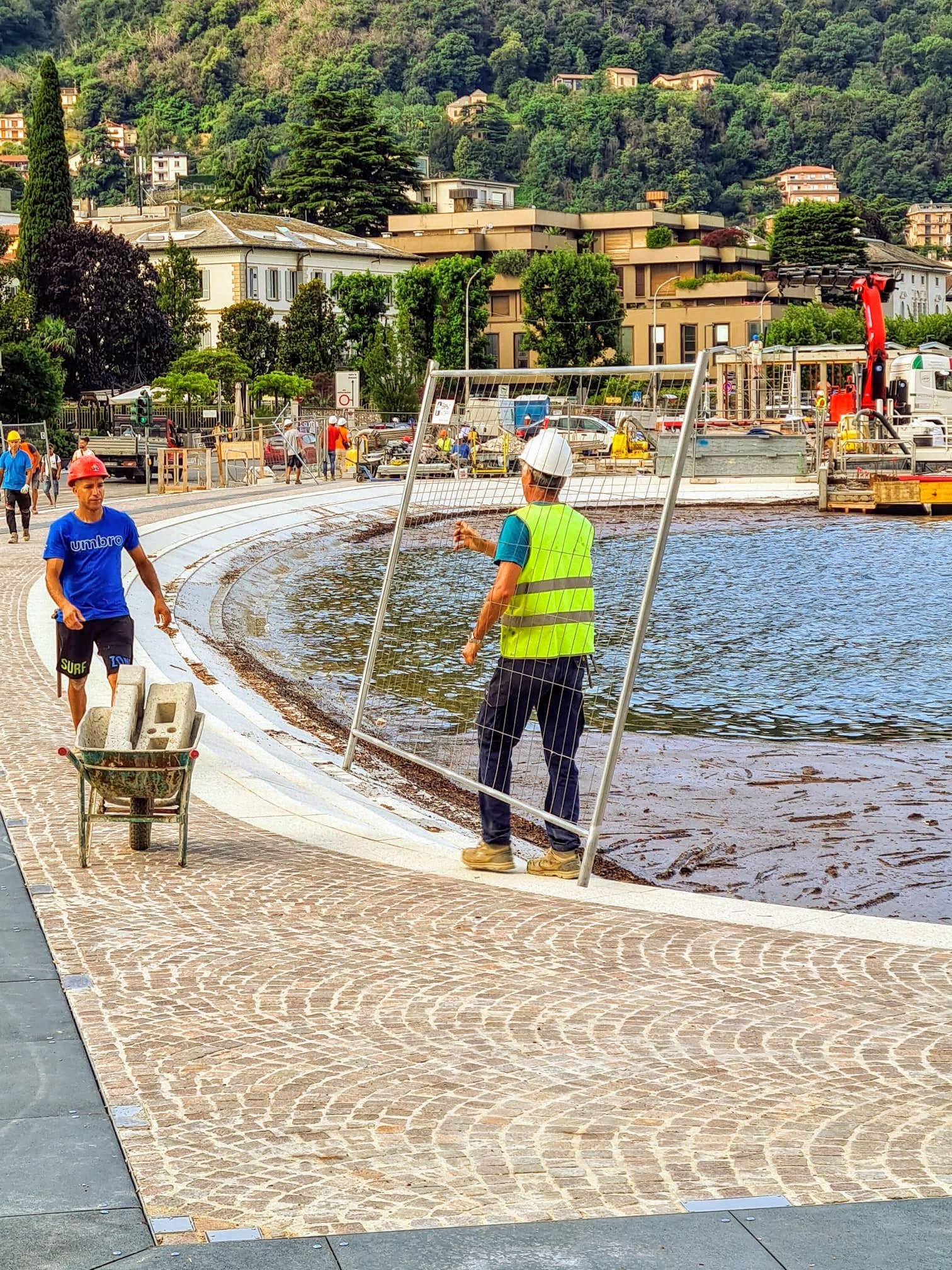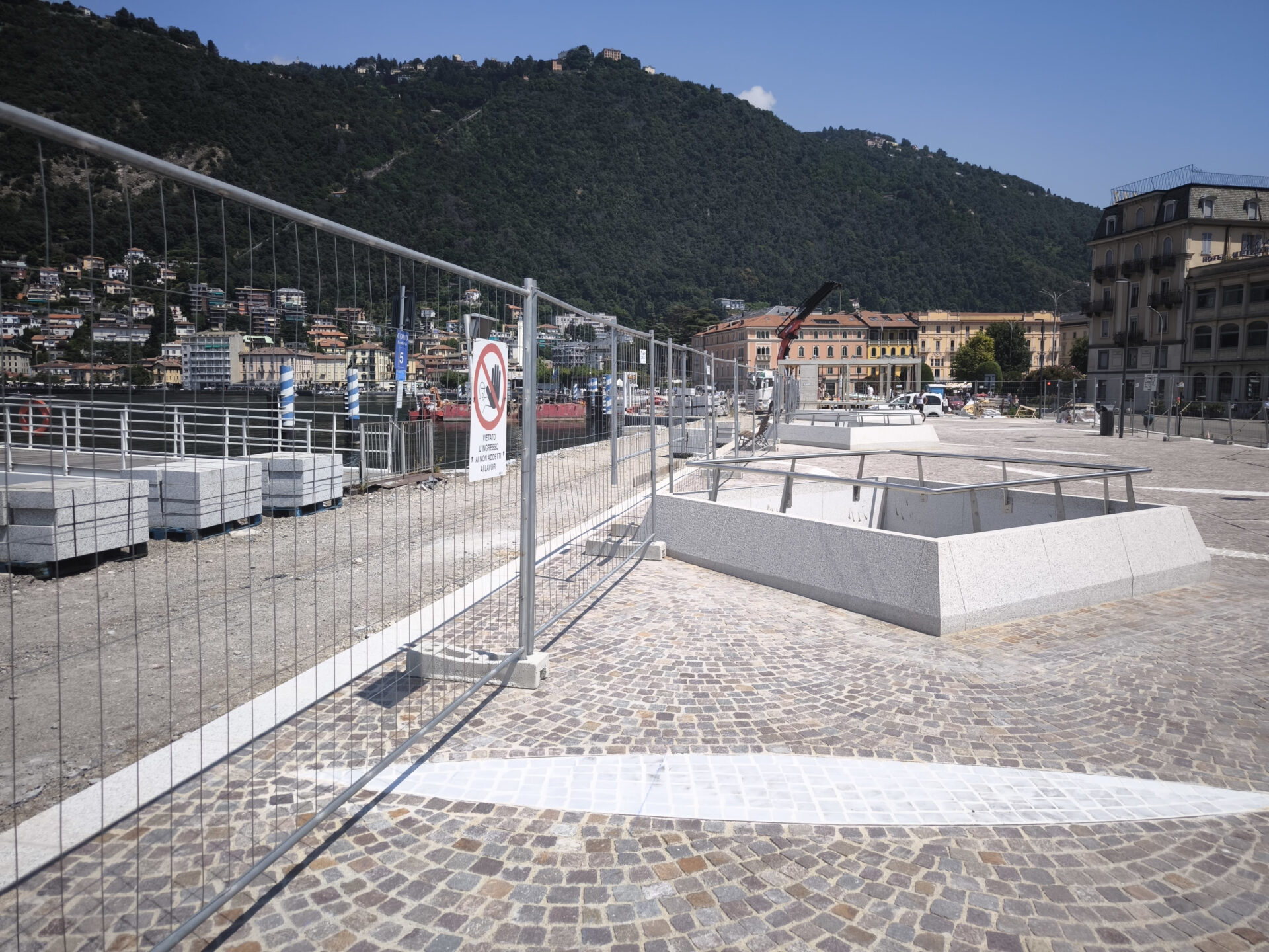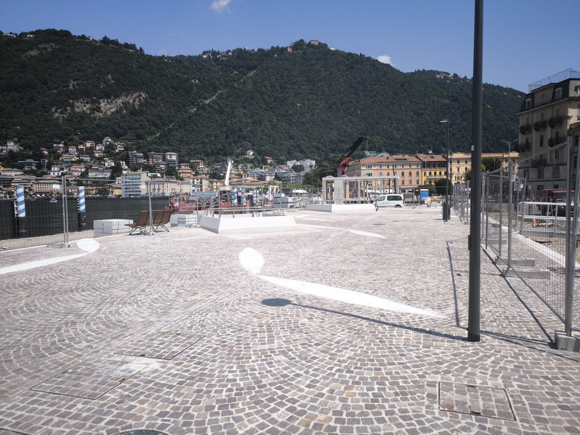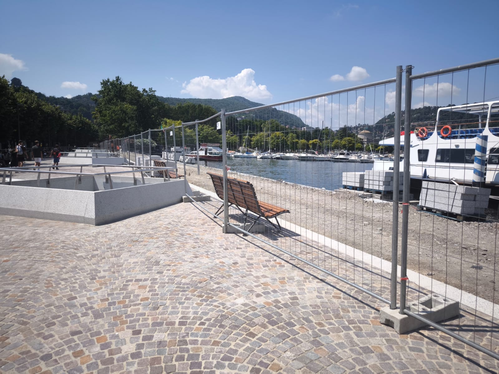 Per vedere l’opera completata ci vorranno ancora dei mesi il sistema delle paratie infatti non ha ancora funzionante il sistema di vasche e pompe per il trattamento delle acque in caso di esondazione (mancano collegamenti elettrici e si attende la discesa del livello del Lario per l’installazione delle ultime paratie manuali sotto la pavimentazione) e continua a mancare parapetto definitivo della passeggiata a lago (per ora restano le transenne provvisorie).