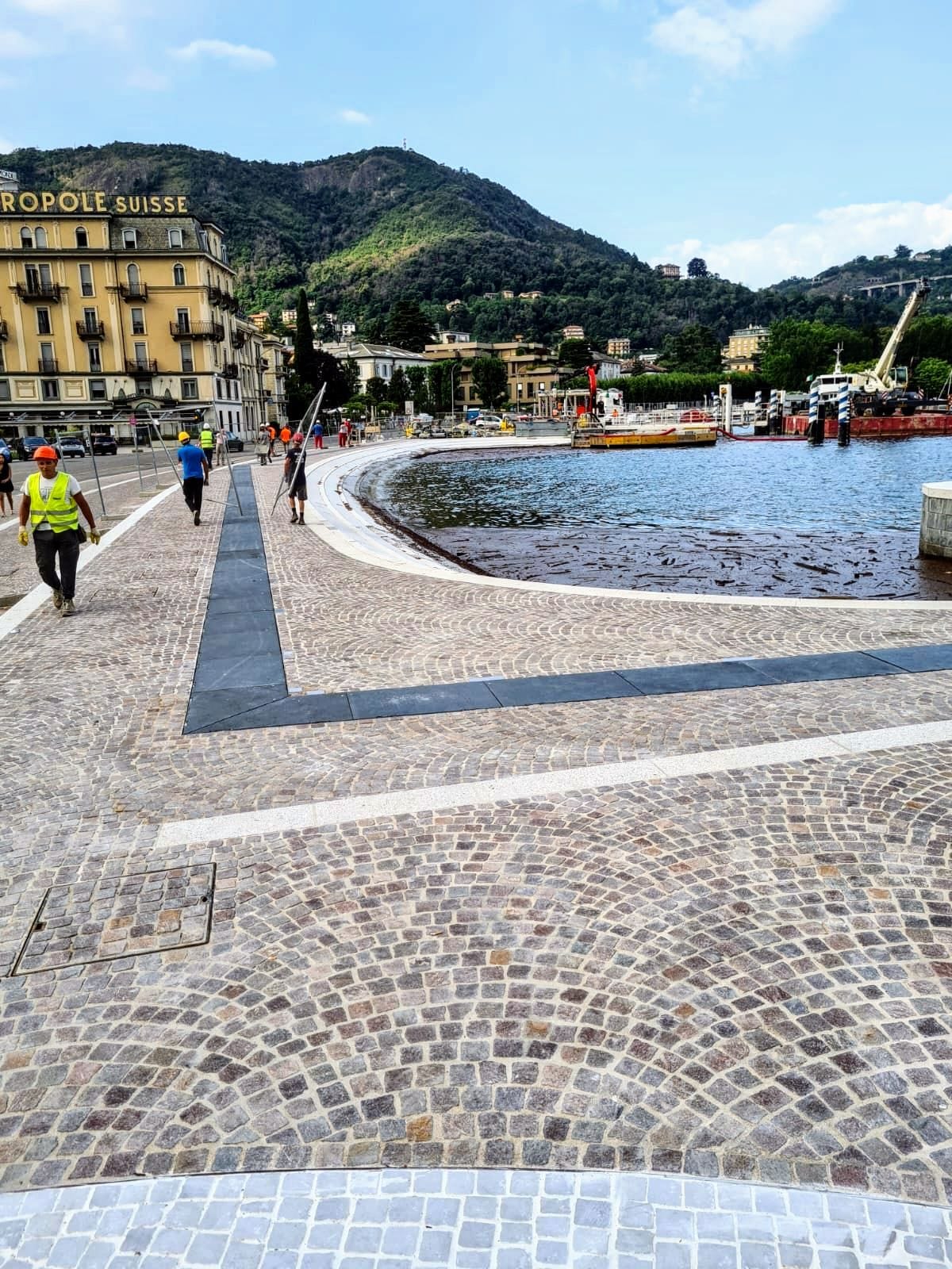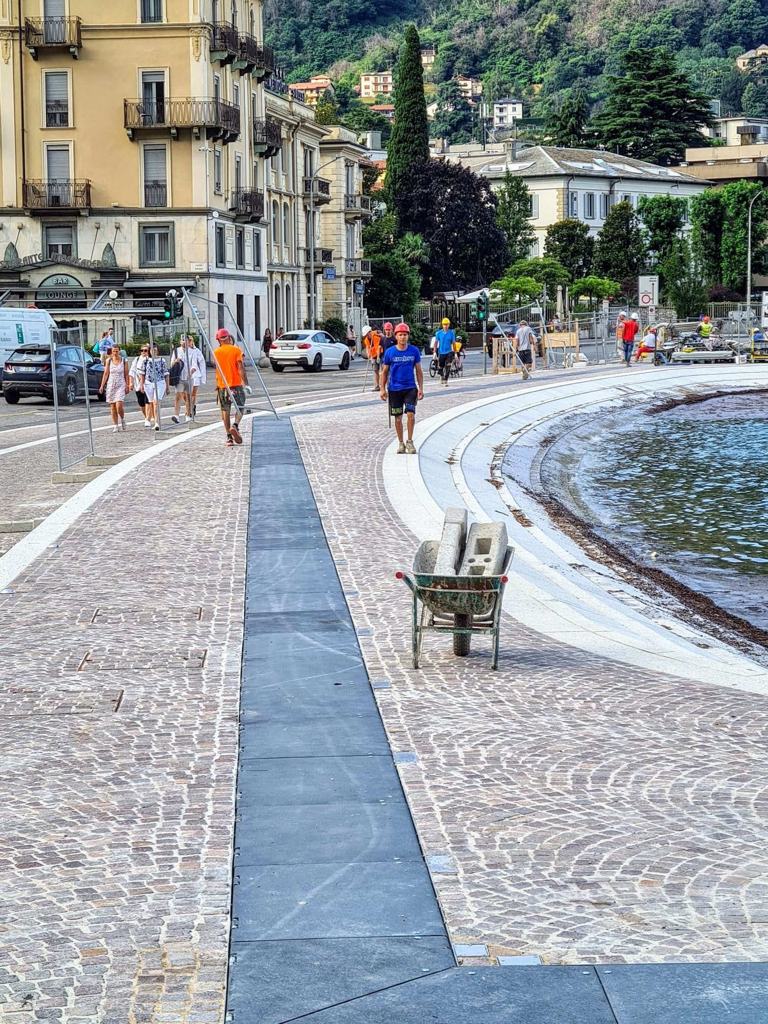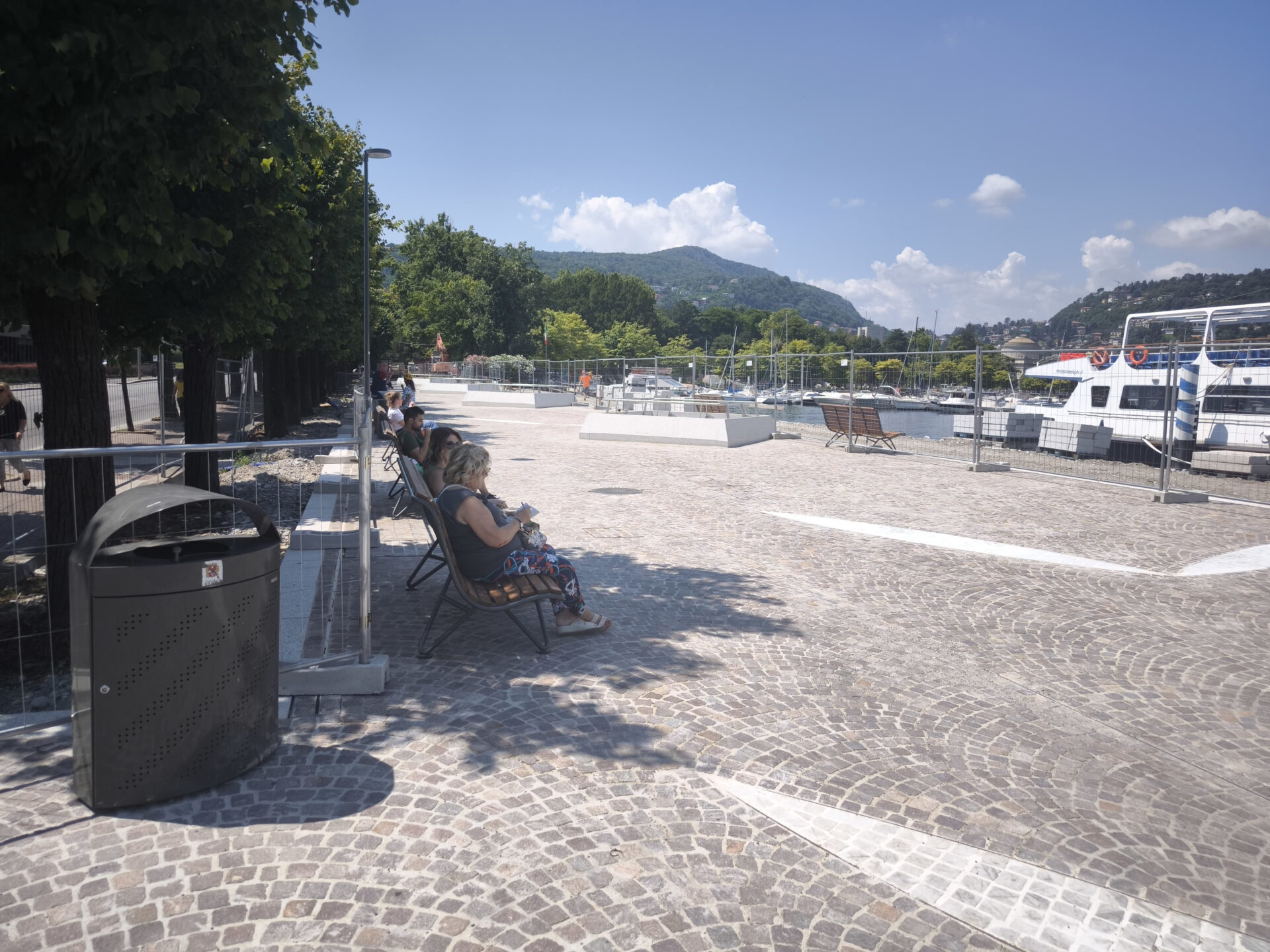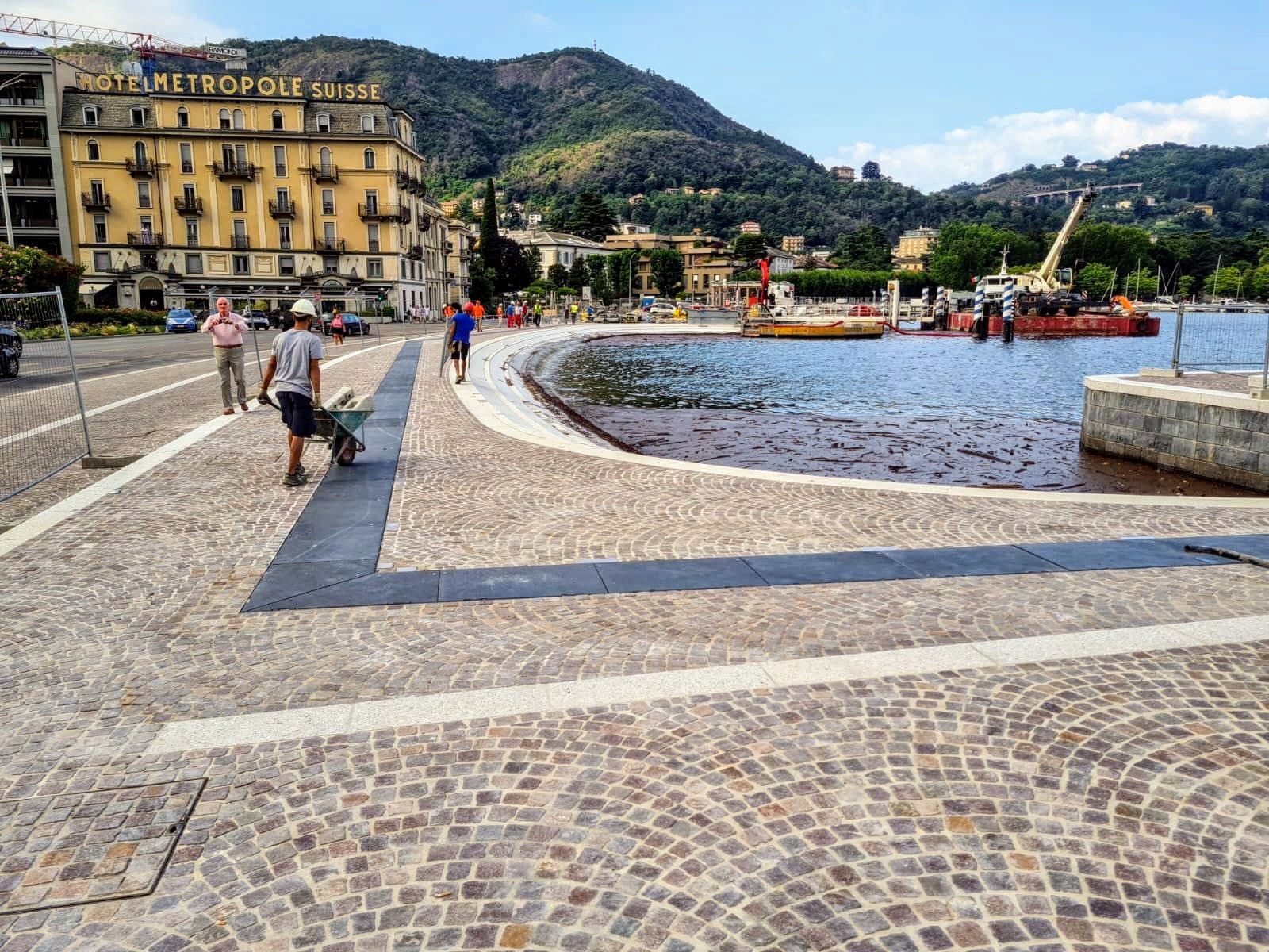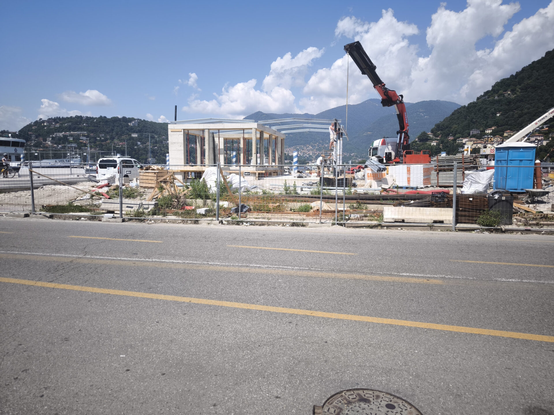 Per vedere l’opera completata ci vorranno ancora dei mesi il sistema delle paratie infatti non ha ancora funzionante il sistema di vasche e pompe per il trattamento delle acque in caso di esondazione (mancano collegamenti elettrici e si attende la discesa del livello del Lario per l’installazione delle ultime paratie manuali sotto la pavimentazione) e continua a mancare parapetto definitivo della passeggiata a lago (per ora restano le transenne provvisorie).