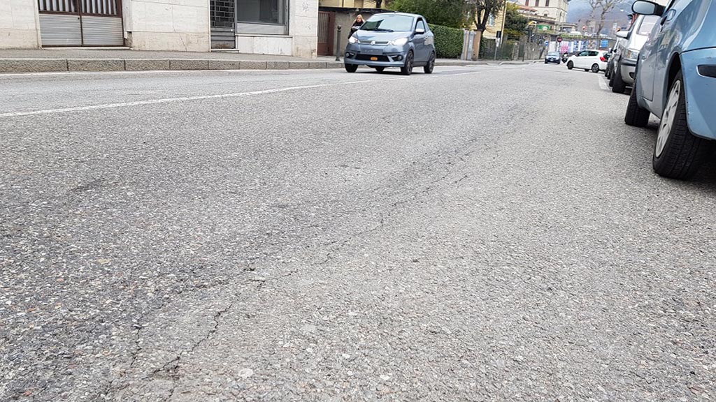 Un altro tema – anche questo già segnalato a Palazzo Cernezzi – riguarda le condizioni dell’asfalto. In effetti sono ampiamente visibili ad occhio nudo profondi avvallamenti in perfetta corrispondenza con il punto di transito degli pneumatici: il “solco” – almeno 3-4 centimetri nei punti più evidenti – è rettilineo e costante.