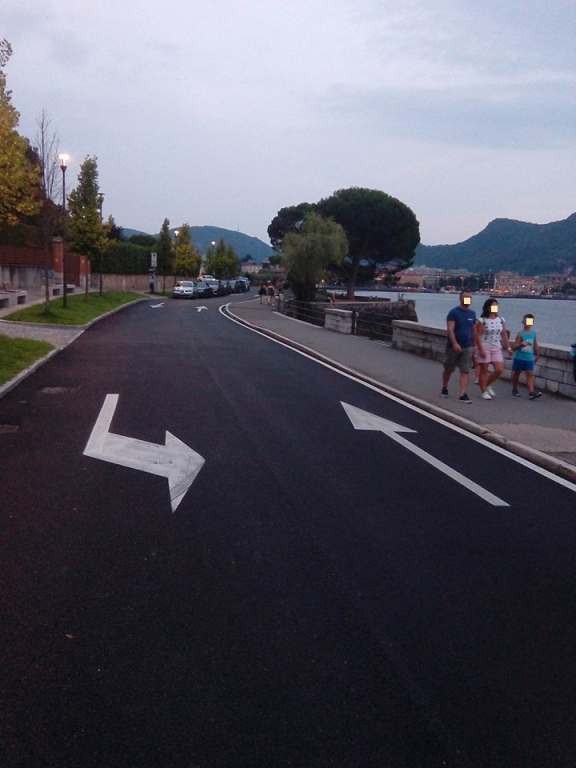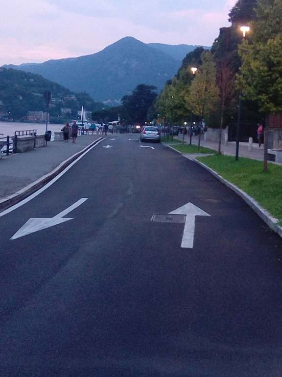 a parte a parte il fatto che l’automobilista lo capisce da solo che bisogna accostarsi a destra per far passare le altre autovetture altrimenti non ci si passa, trovo demenziale che durante i lavori di di rifacimento della passeggiata e delle aiuole non si sia pensato ad allargare la strada di 30 40 cm oppure in alternativa che non si sia ristretto il marciapiede controlaterale degli stessi 30/40 cm!!!! Lo spazio per due autoveicoli non c’è Tanto è vero che le auto sono costretti a salire sul marciapiede lato lago