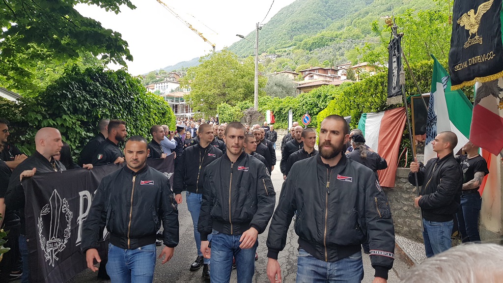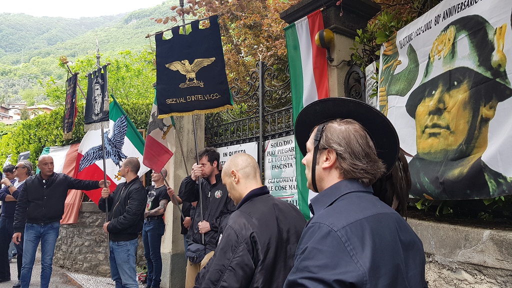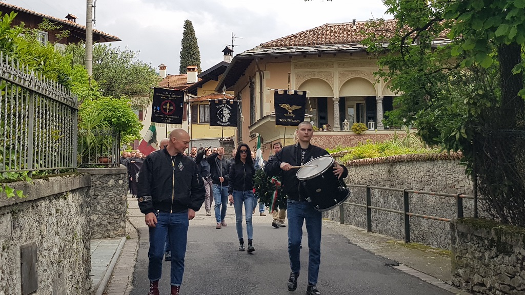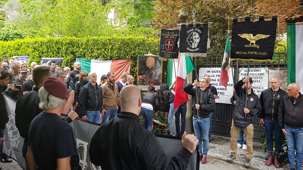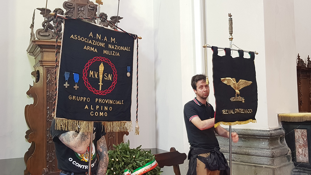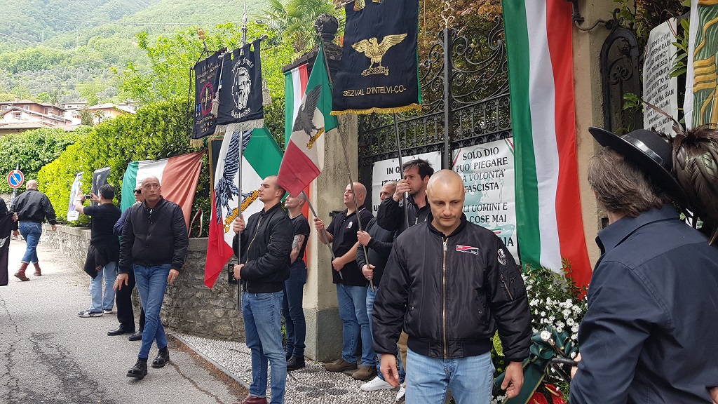 Ma la messa in suffragio di Mussolini e Claretta – chiesa pressoché piena, i labari fascisti e del Veneto Fonte Skinheads, gli stessi del celebre blitz nella sede di “Como Senza Frontiere”, ai lati dell’altare – è stata soltanto un segmento della mattina a Mezzegra.