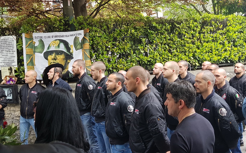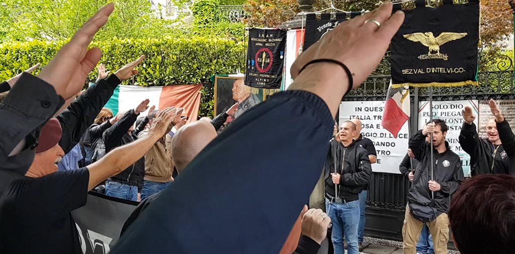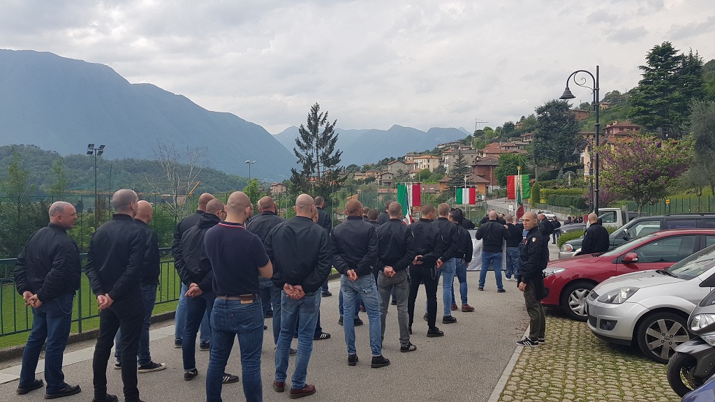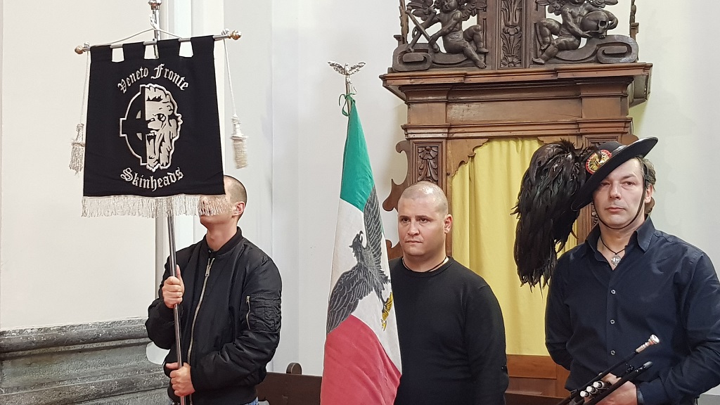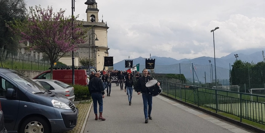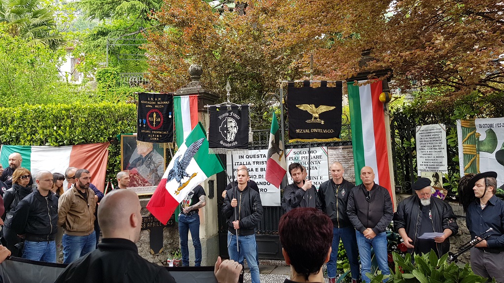 Ma la messa in suffragio di Mussolini e Claretta – chiesa pressoché piena, i labari fascisti e del Veneto Fonte Skinheads, gli stessi del celebre blitz nella sede di “Como Senza Frontiere”, ai lati dell’altare – è stata soltanto un segmento della mattina a Mezzegra.