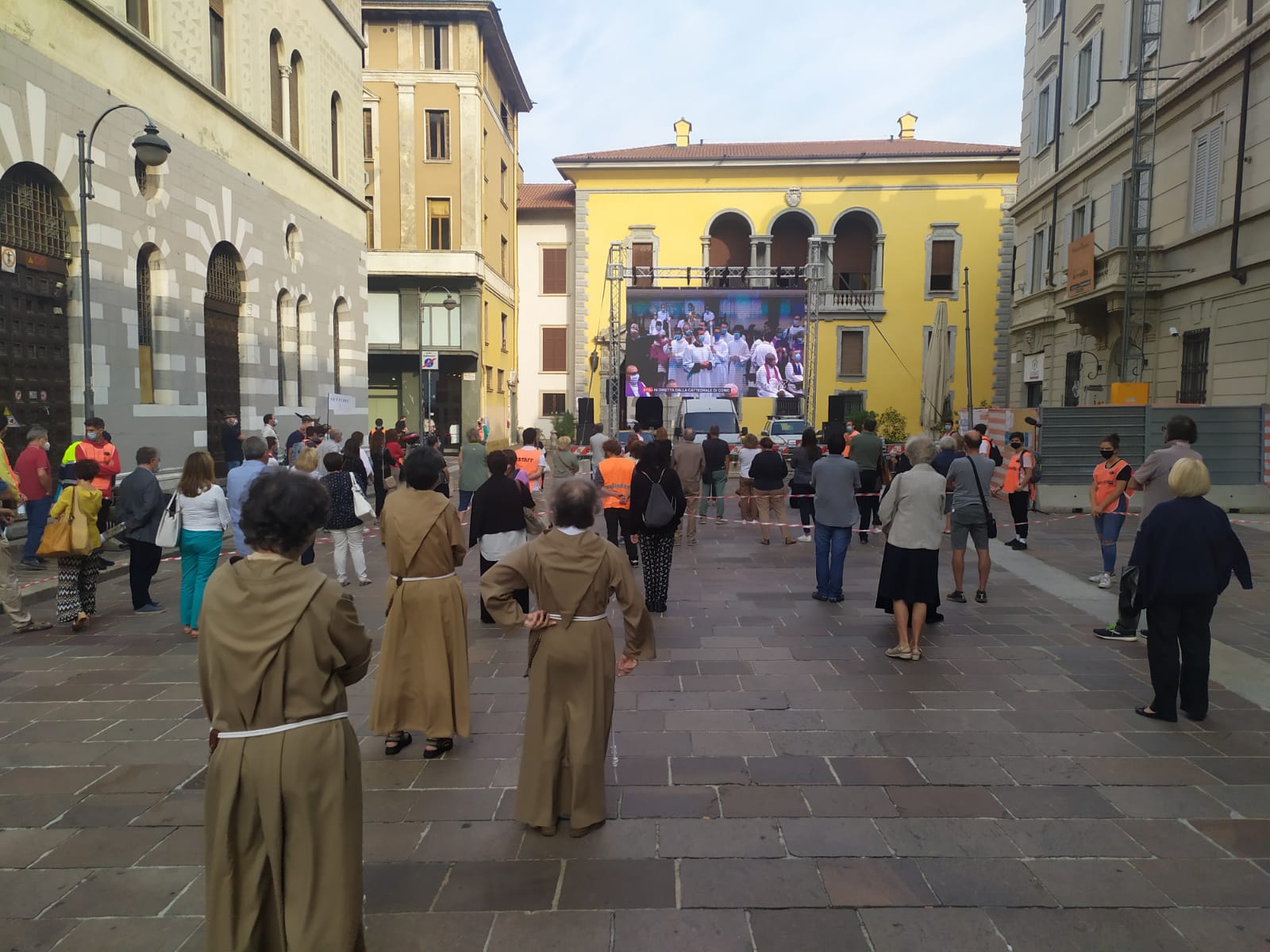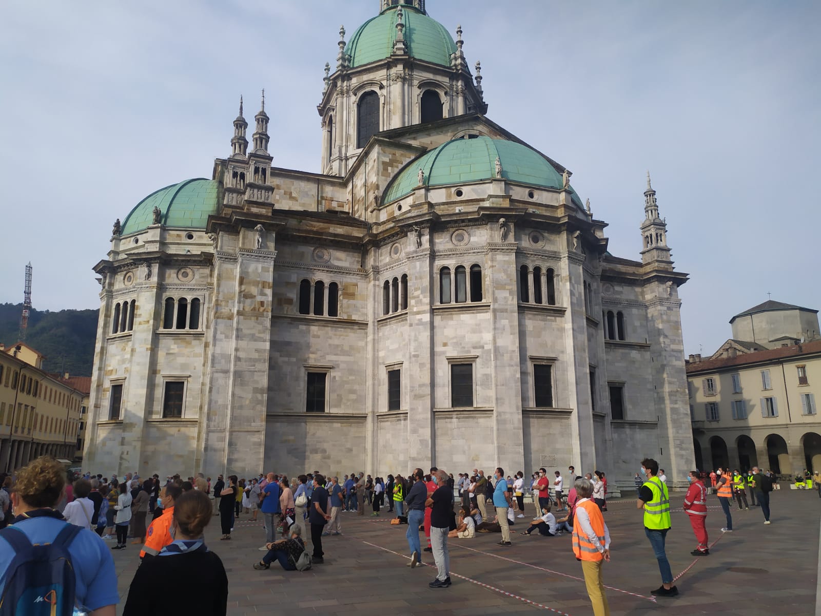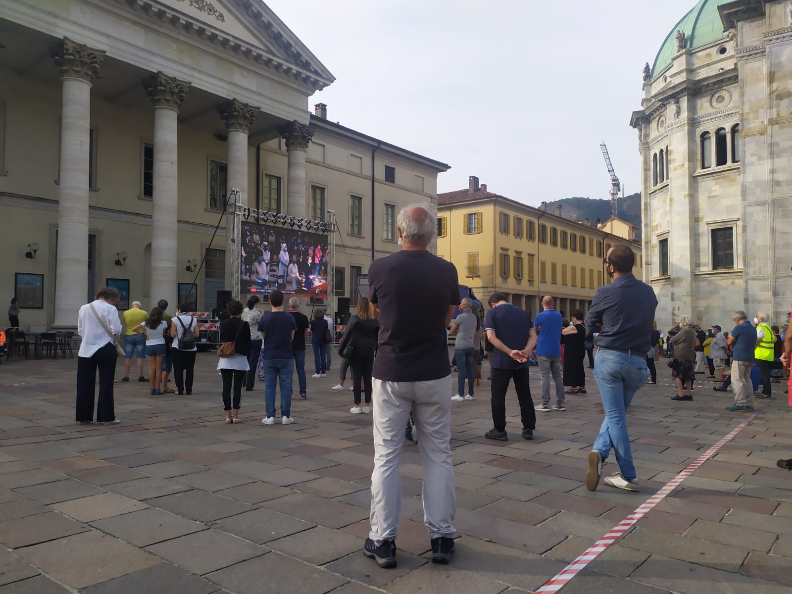 Il centro di Como come una grande chiesa a cielo aperto per il commiato della città da don Roberto Malgesini. Dopo i funerali di ieri a Regoledo, e mentre in Cattedrale si svolge la messa di suffragio (nel video sotto) con posti limitati per le limitazioni anti Covid, nelle piazze attorno (Grimoldi, Verdi e Cavour) molti fedeli hanno seguito la celebrazione grazie ai maxischermi allestiti dalla Diocesi.