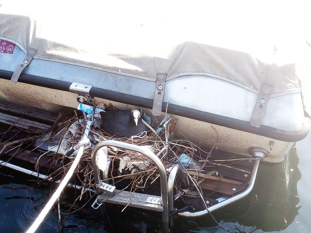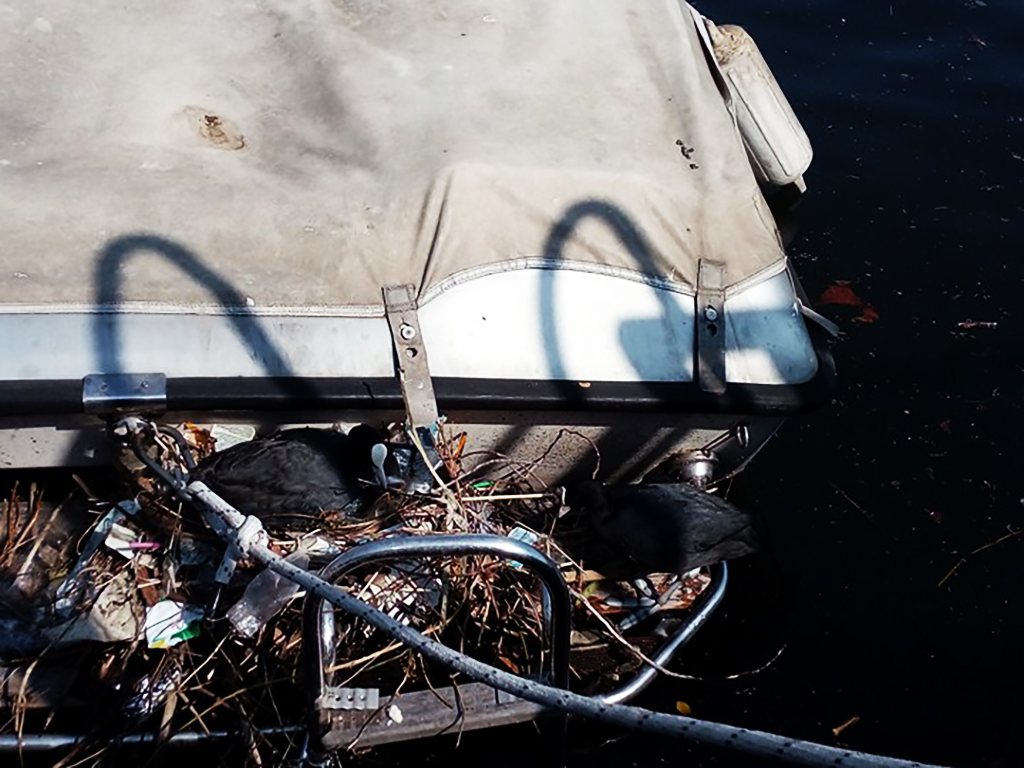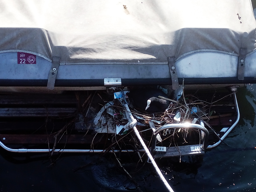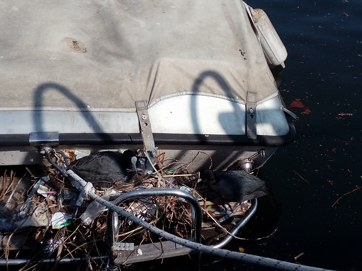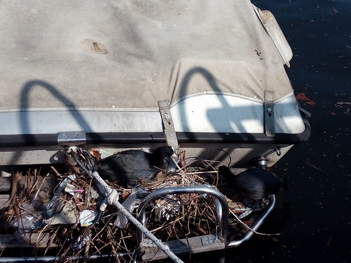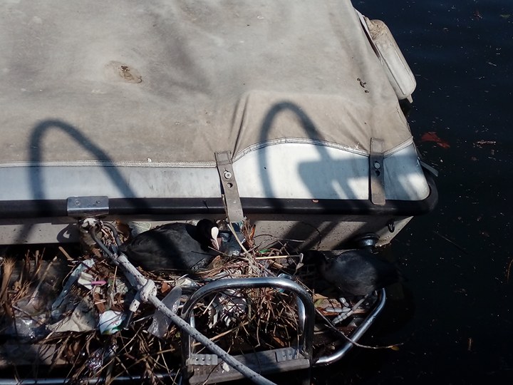 L’animale scansa quel che resta di un pacchetto di fazzoletti, offre la precedenza a una bottiglia, supera un’arancia e confonde una scatola di plastica per terraferma. A pochi passi due Folaghe da giorni hanno scelto lo scalino di un motoscafo per costruire, pezzo dopo pezzo, il nido per una prossima covata. Metodici, certosini, i due pennuti intrecciano legnetti, cannucce, confezioni per gelati e altri non meglio identificabili, certamente non naturali, avanzi di una domenica pomeriggio.
