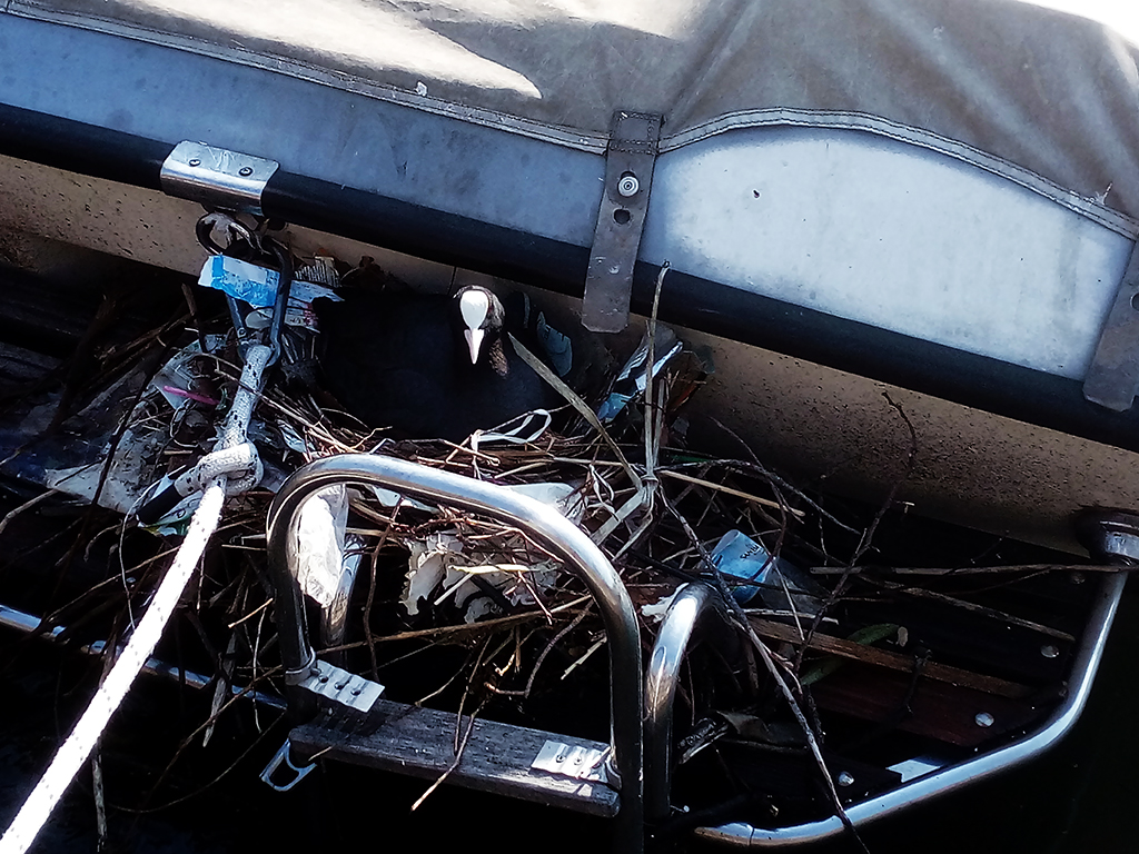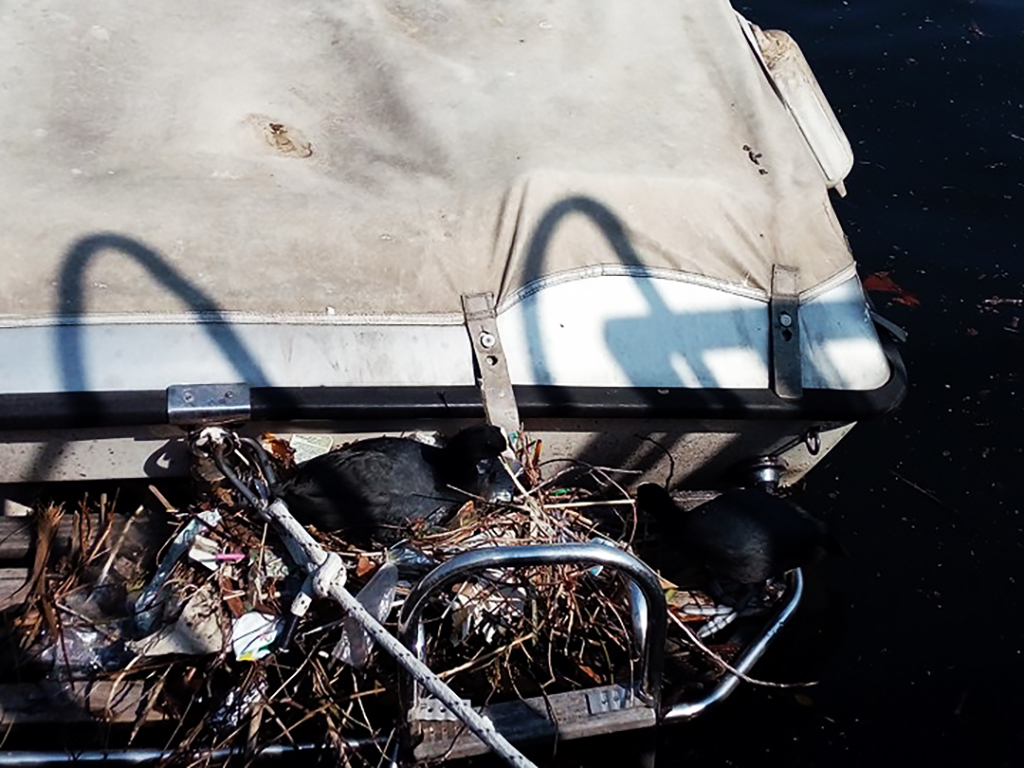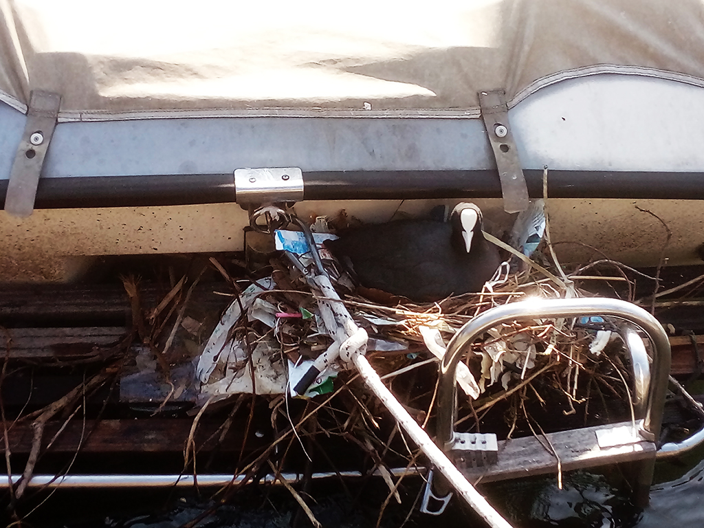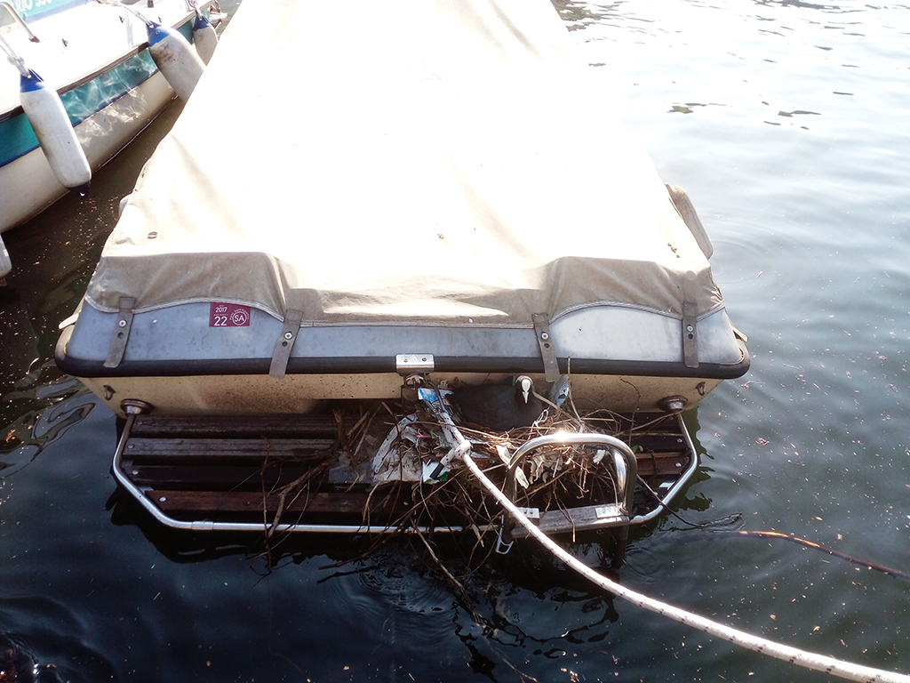 L’animale scansa quel che resta di un pacchetto di fazzoletti, offre la precedenza a una bottiglia, supera un’arancia e confonde una scatola di plastica per terraferma. A pochi passi due Folaghe da giorni hanno scelto lo scalino di un motoscafo per costruire, pezzo dopo pezzo, il nido per una prossima covata. Metodici, certosini, i due pennuti intrecciano legnetti, cannucce, confezioni per gelati e altri non meglio identificabili, certamente non naturali, avanzi di una domenica pomeriggio.