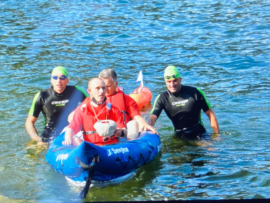 Così Michele, insieme all’amico Alberto, commenta l’impresa compiuta oggi pomeriggio: la traversata del lago a nuoto, trainando una canoa con a bordo due persone di Alveare onlus, associazione che “si occupa principalmente del tempo libero delle persone diversamente abili, ritrovandosi tutte le domeniche, ed organizzando le vacanze estive”.