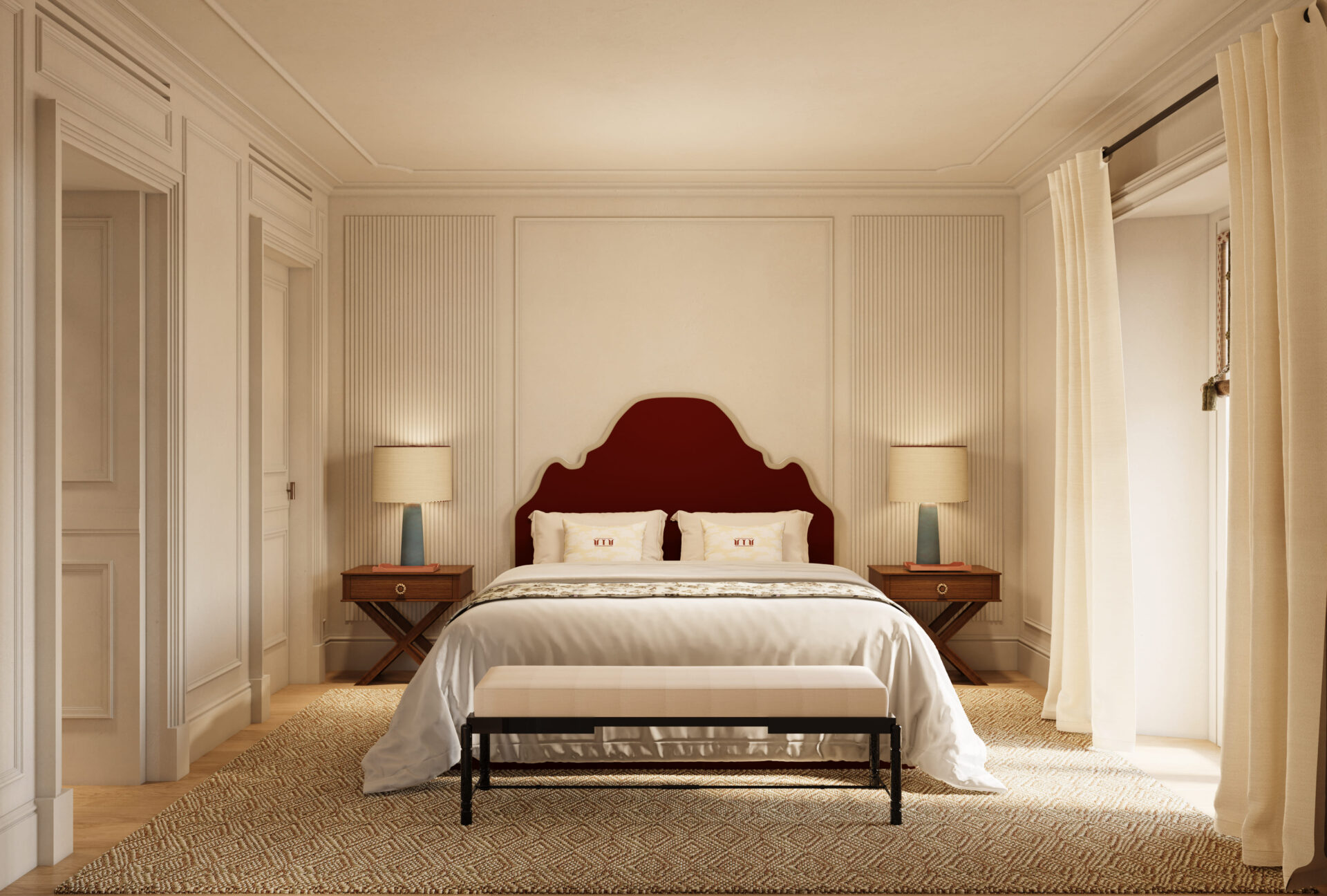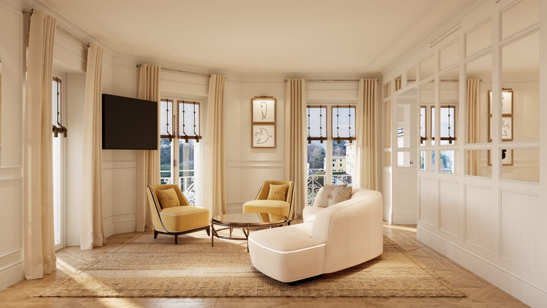 L’estetica degli spazi, che vede la collaborazione dell’azienda tessile Dedar, si ispira alla tradizione delle ville lariane e al lavoro di designer legati al territorio come Ico Parisi, integrando una palette cromatica chiara e materiali locali in un contesto contemporaneo.