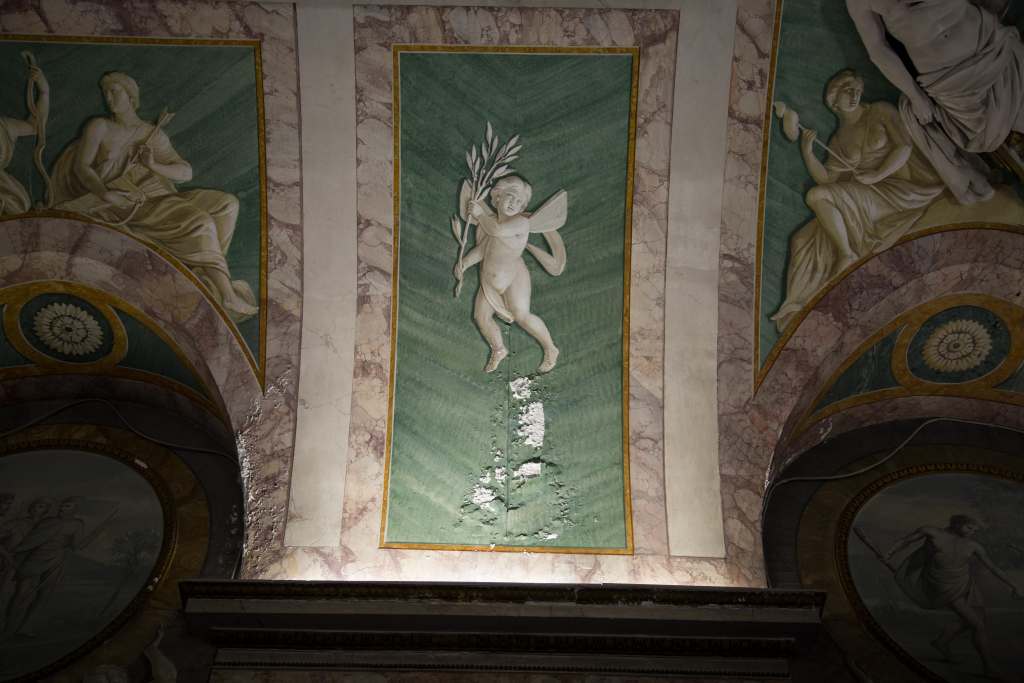 Lentamente (ma voracemente) la muffa si sta pappando interi affreschi riducendoli a polvere finissima che come neve si deposita sul pavimento sconnesso. Colpa di infiltrazioni continue.