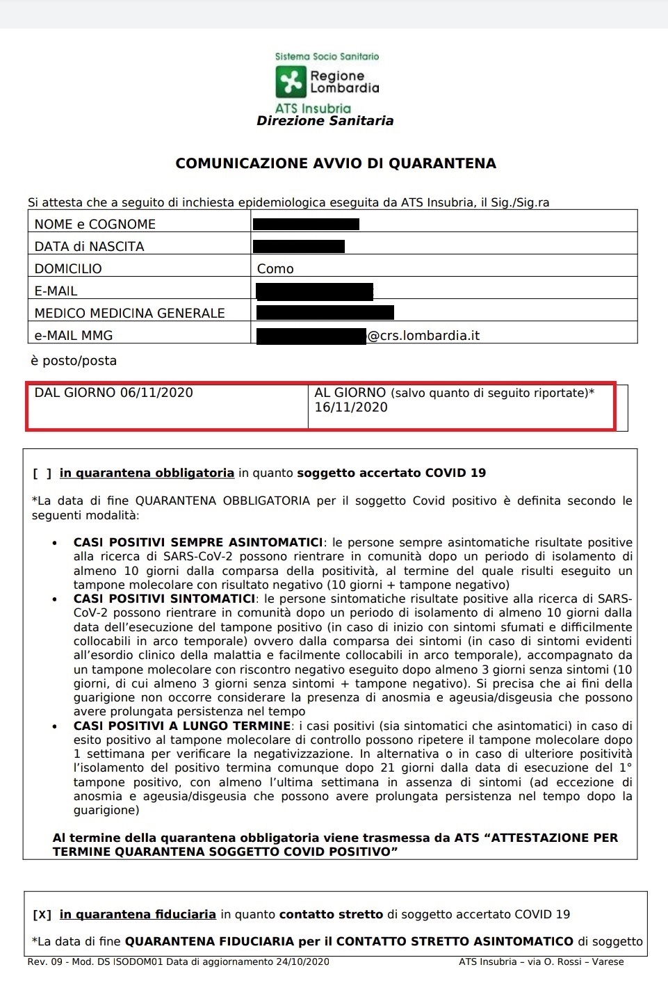 E’ quello che sta succedendo a molti ed è quello che ieri, 18 novembre, è successo ai genitori di Federico (il nome è di fantasia per tutelarne la privacy): “Mercoledì abbiamo ricevuto una mail da parte di Ats Insubria nella quale ci veniva comunicato che nostro figlio era venuto in contatto con una persona positiva al Covid – racconta la mamma – fin qui niente di strano, finché abbiamo letto che sarebbe dovuto rimanere in quarantena fiduciaria dal 6 al 16 novembre”. Vale a dire fino a lunedì, due giorni prima dell’invio della mail.