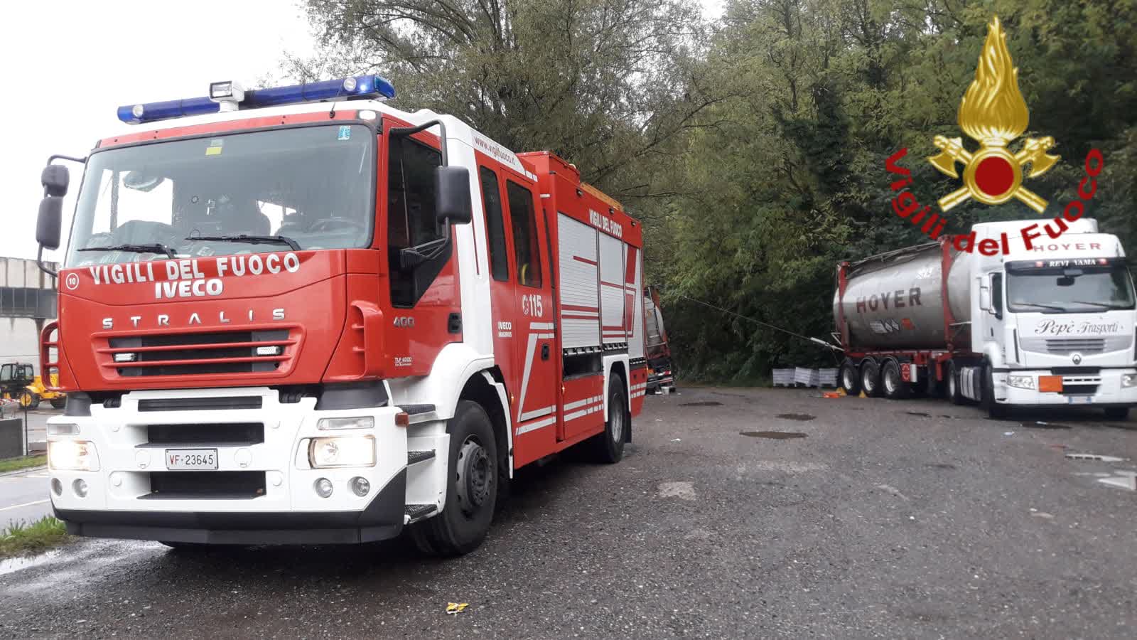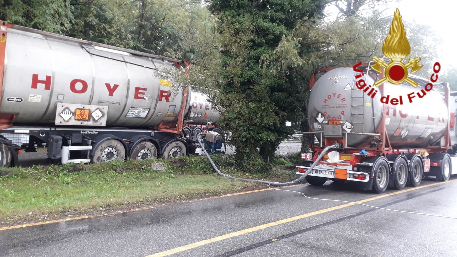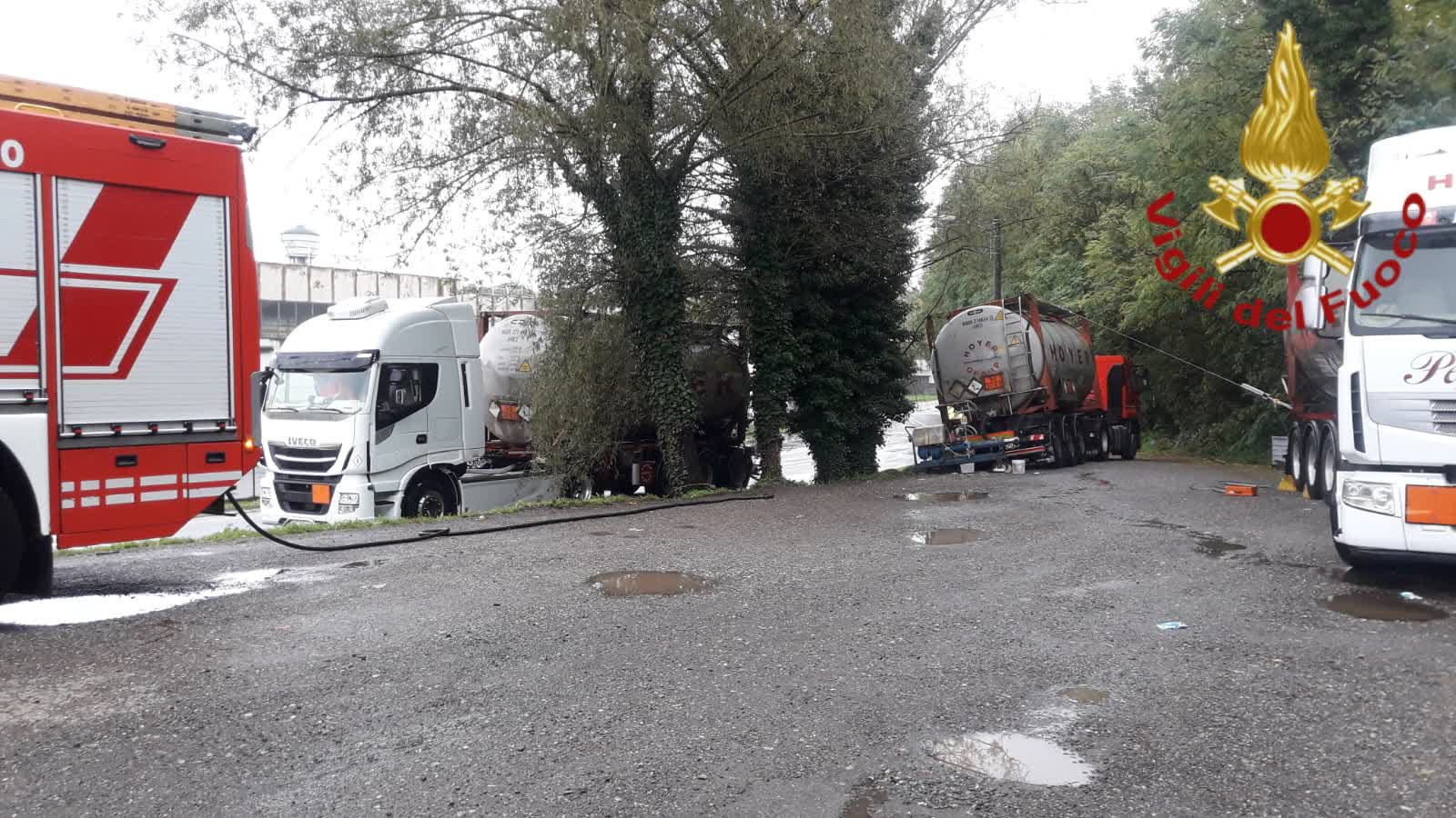 Il terreno sotto l’autocisterna in sosta ha ceduto, richiedendo l’intervento di un secondo veicolo nel quale travasare il liquido pericoloso.