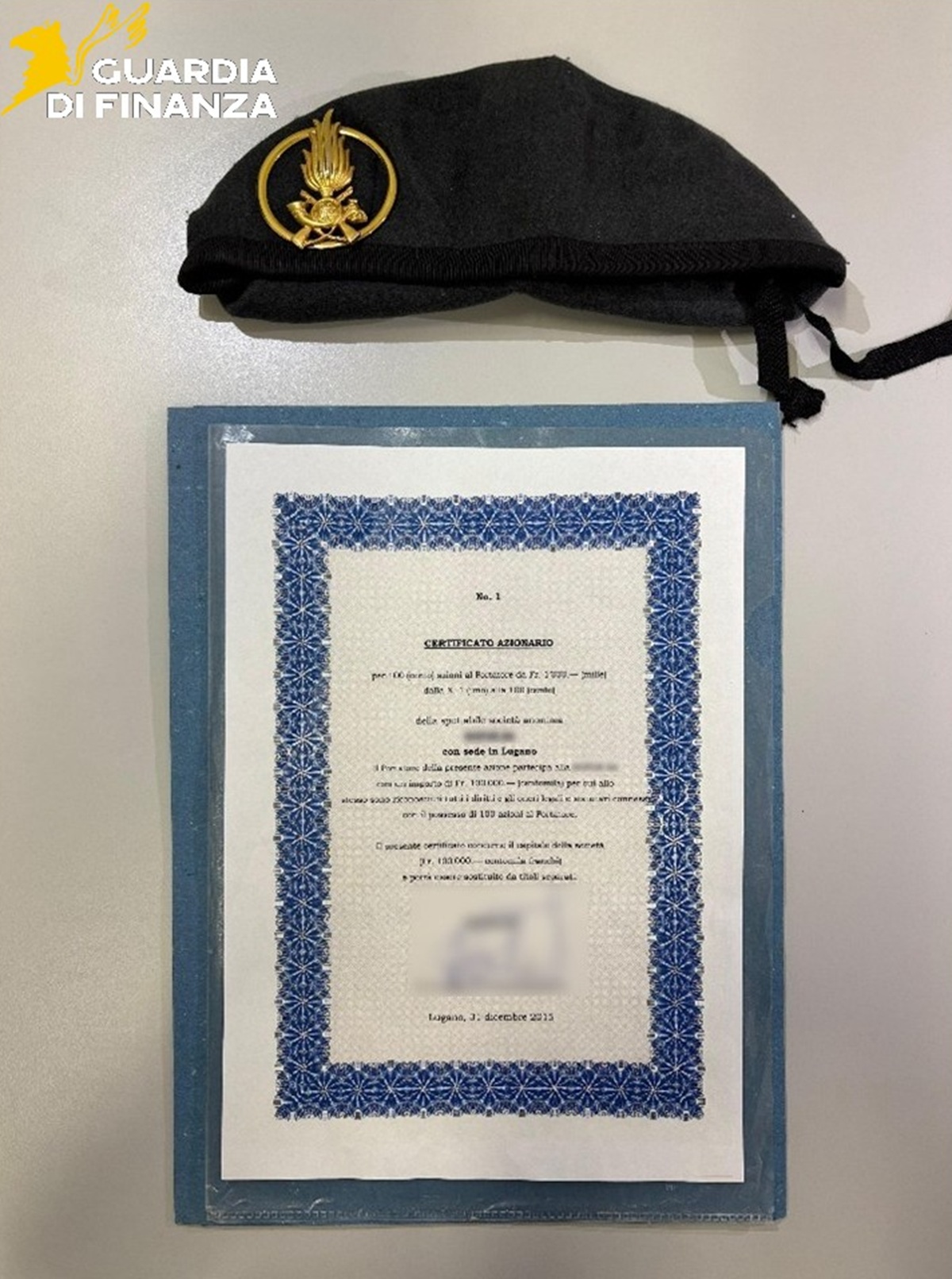 Considerato lo stato di agitazione palesato nell’occasione, gli operanti hanno deciso di approfondire il controllo sulla persona e sulla valigetta al seguito, rinvenendo, all’interno di quest’ultima, un certificato azionario al portatore emesso da una società elvetica del valore di 100mila franchi oltre a denaro contante rientrante nei limiti di legge.