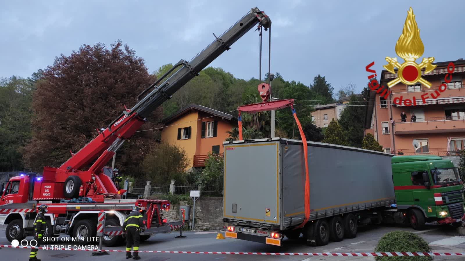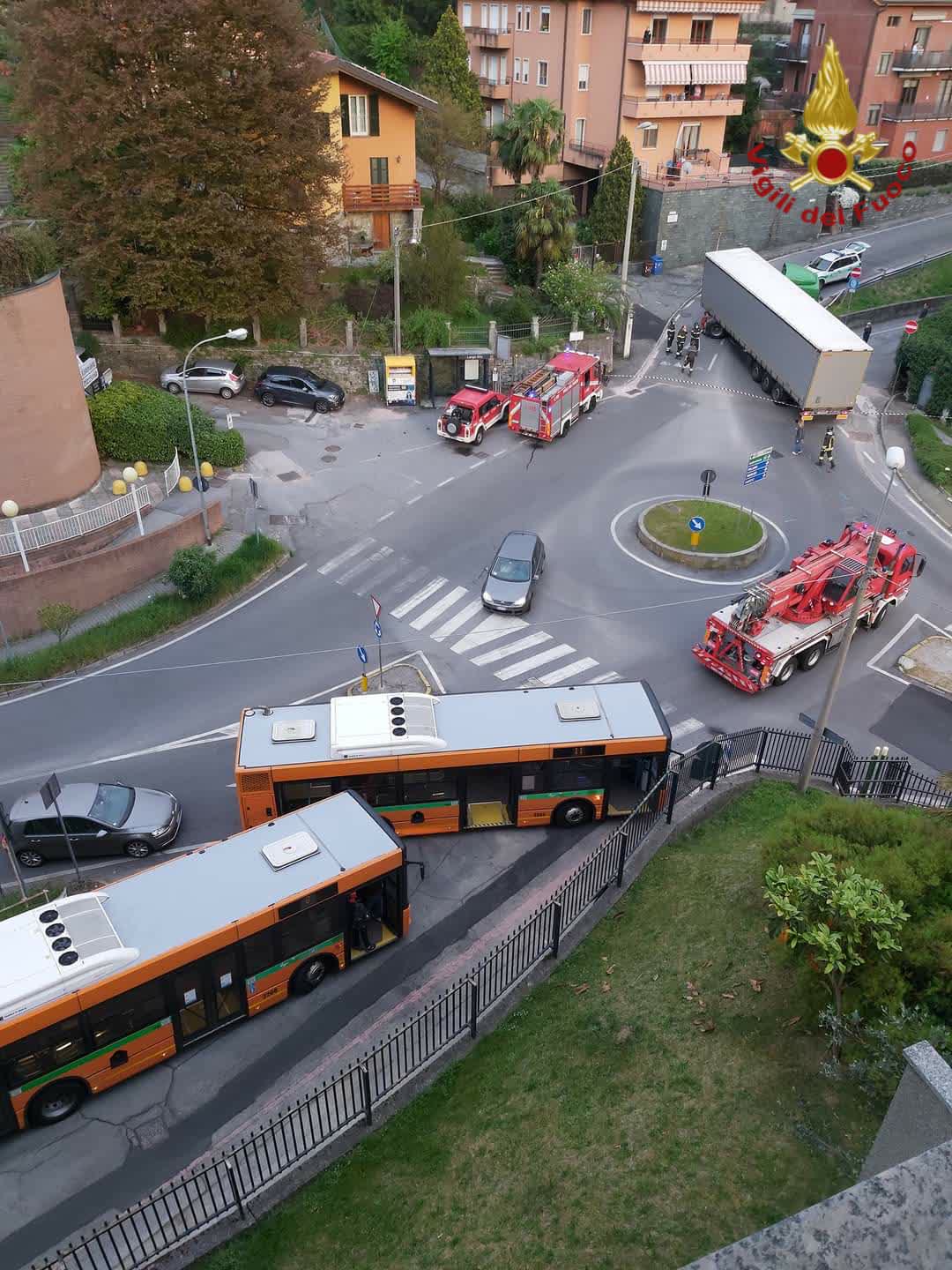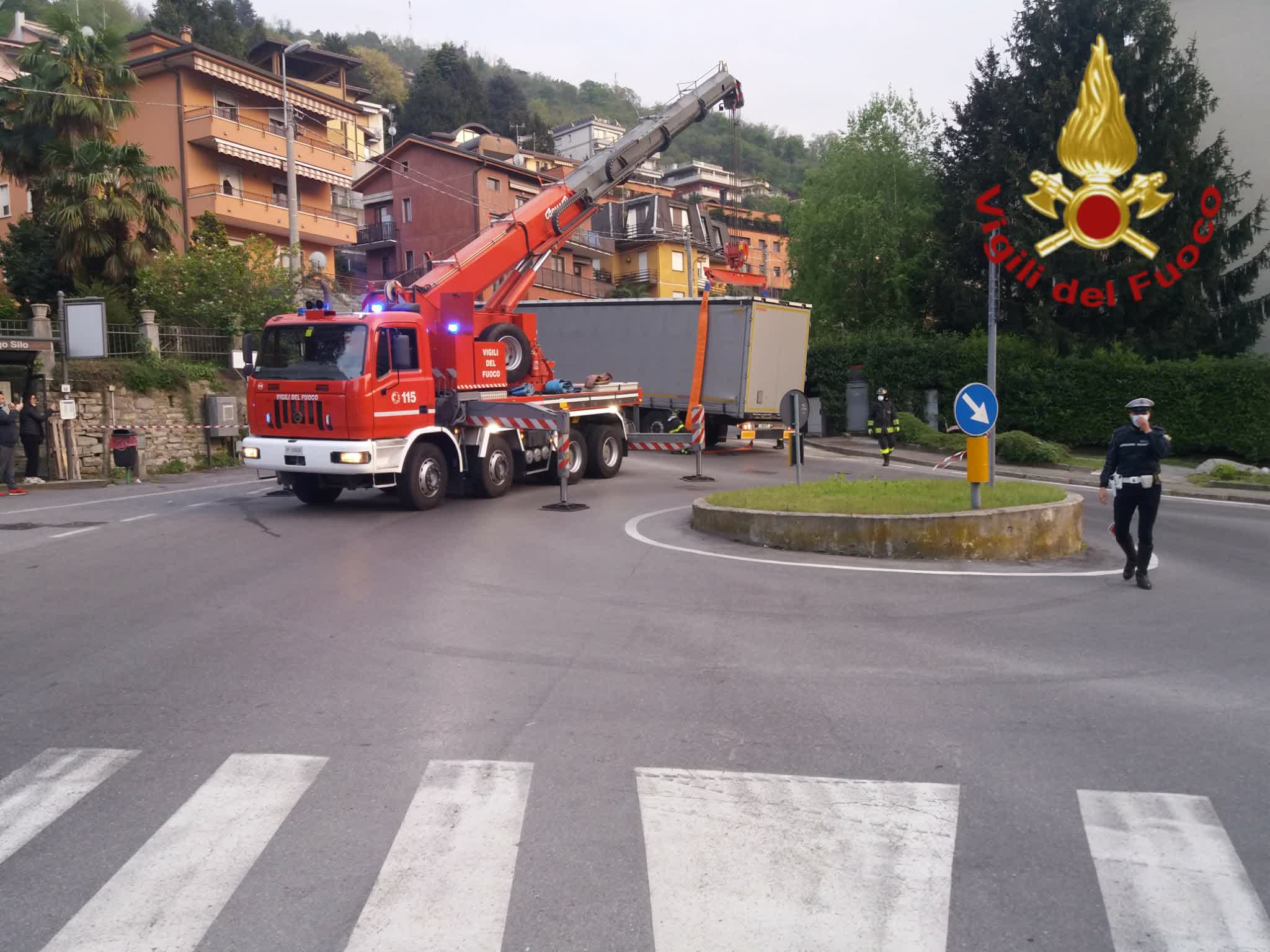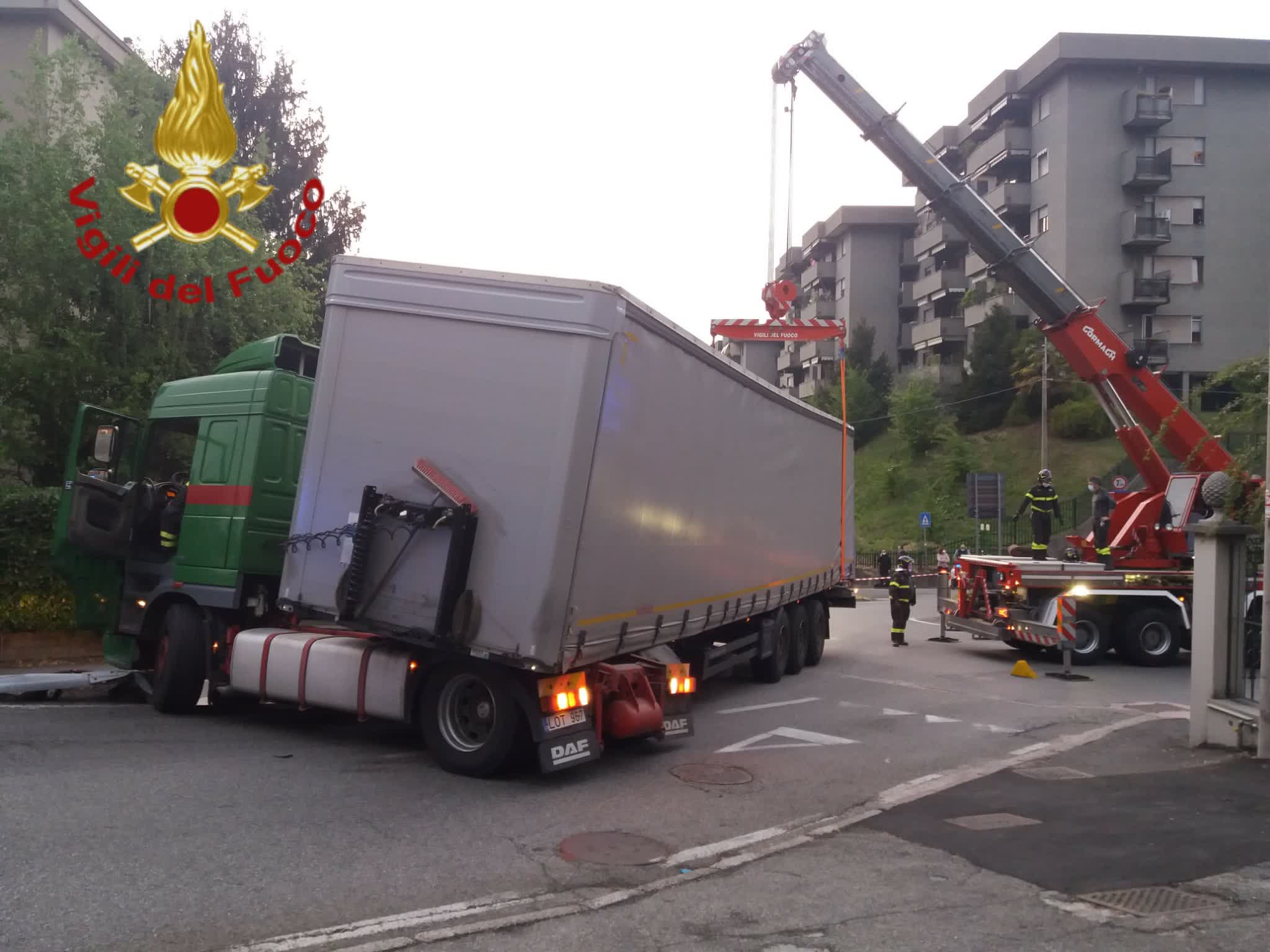 Operazioni complesse per i vigili del fuoco del comando di via Valleggio. Non solo per la mole del mezzo ma anche per il carico, pesantissimo, di metalli stipato nel container. Sul posto è arrivata la gru dei pompieri mentre la polizia locale si è occupata della viabilità.