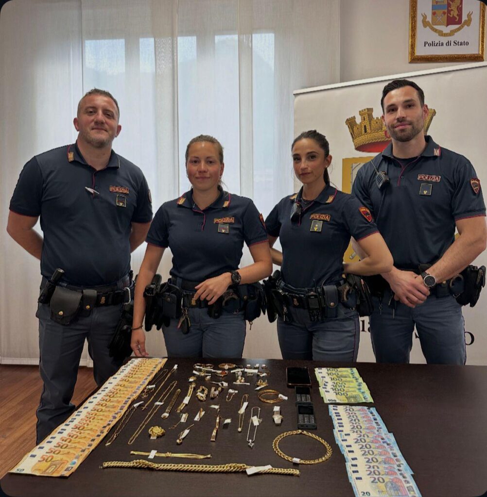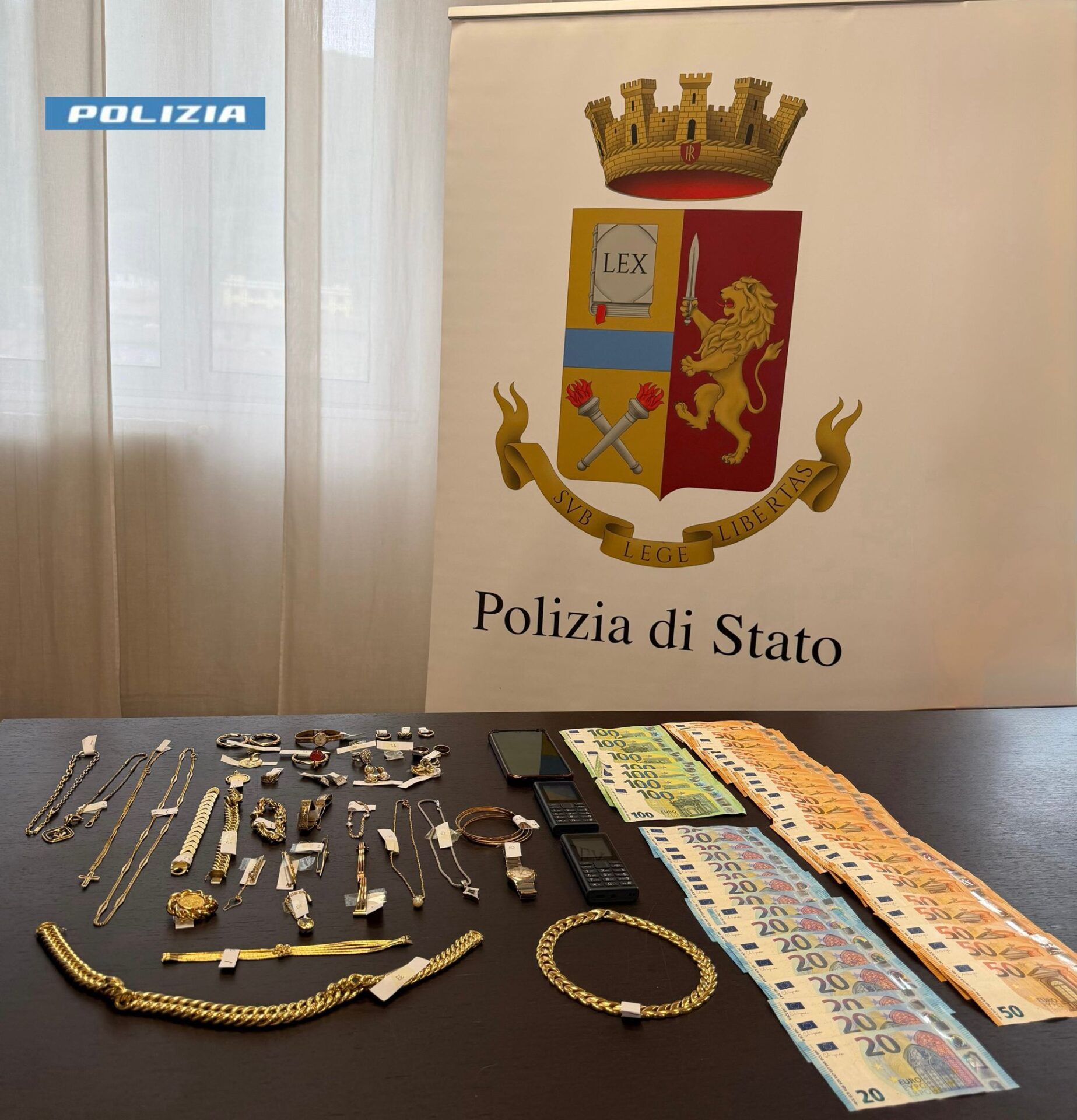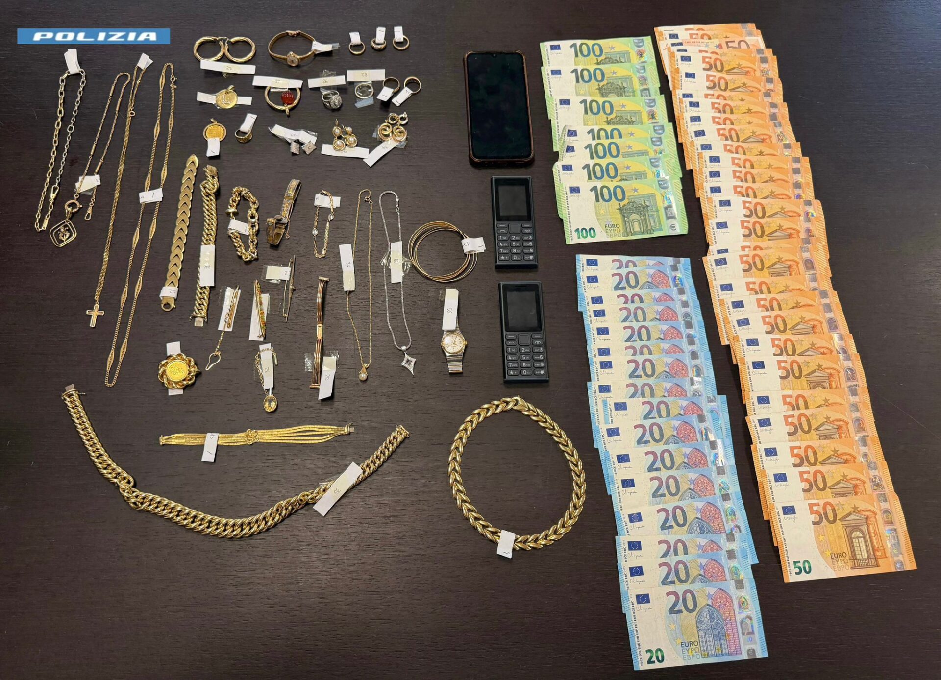 Perquisita, la donna è stata trovata in possesso di due sacchetti contenenti monili d’oro e d’argento, oltre che gioielli e denaro in contanti, in parte nascosto anche negli indumenti personali, per un totale di circa 2.400 euro in diversi tagli, nonché tre telefoni cellulari.