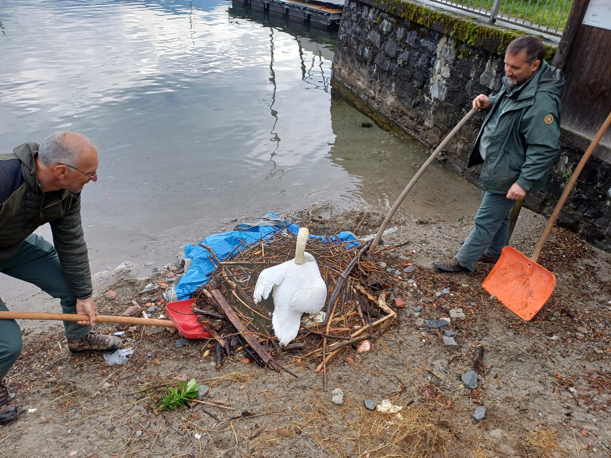 Le abbondanti piogge degli ultimi giorni avevano causato l’innalzamento del livello del lago, mettendo a serio rischio il nido. Se l’acqua avesse raggiunto le uova, queste si sarebbero raffreddate, compromettendone irrimediabilmente la possibilità di schiusa. Approfittando di un momento di assenza del cigno maschio – notoriamente più aggressivo – gli agenti sono riusciti a intervenire, spostando il nido in una posizione più elevata e sicura rispetto alla linea di riva.