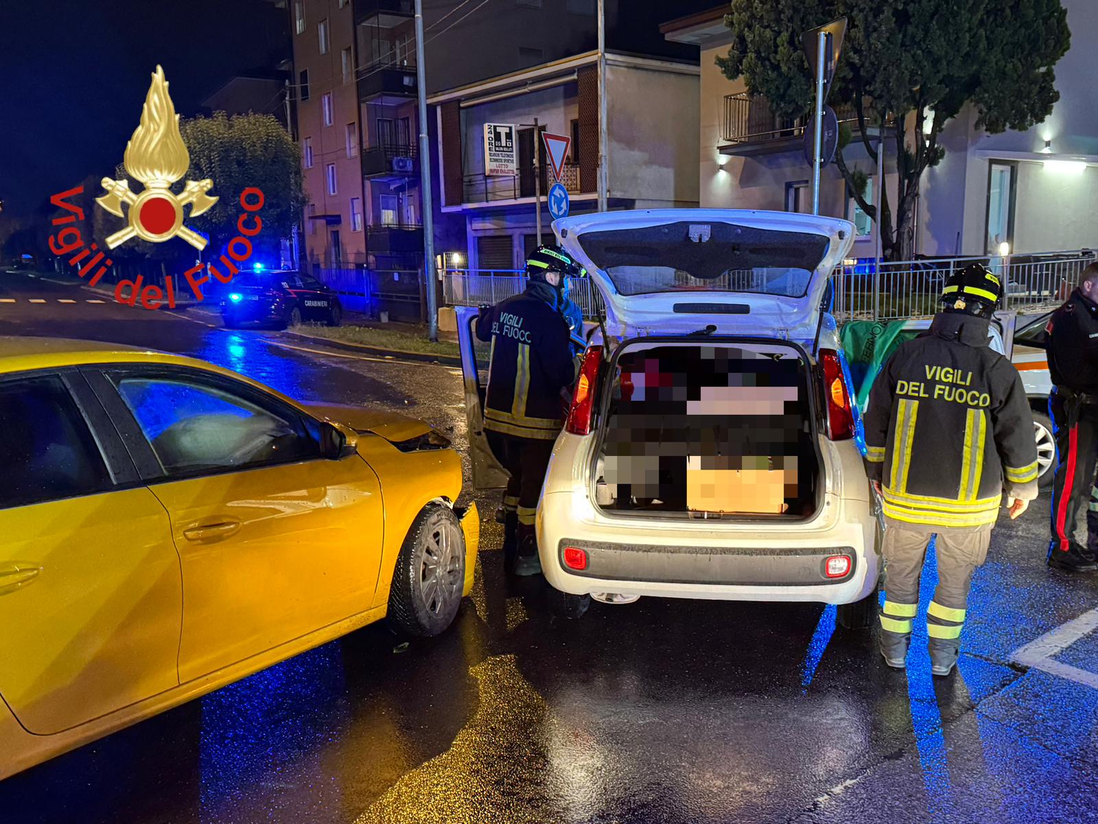 Intervento dei vigili del fuoco questa sera a Luisago in via Risorgimento, angolo via Roma, per uno schianto tra due auto. Una persona ferita è rimasta incastrata tra le lamiere. Trasportata in codice giallo in ospedale dal 118. Dinamica da chiarire.