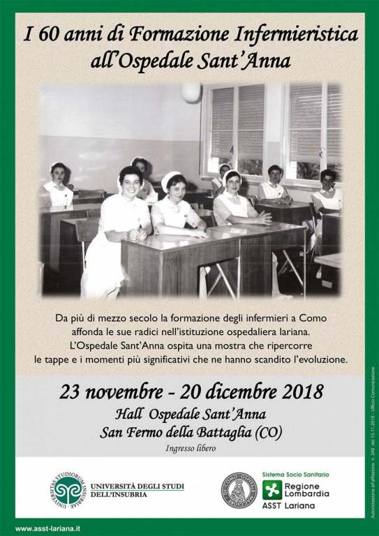 Dalla Scuola Convitto, passando per quella regionale fino al corso di Laurea con l’Università degli Studi dell’Insubria. Dal 23 novembre al 20 dicembre il presidio di San Fermo della Battaglia dell’Asst Lariana ospiterà la mostra “I 60 anni di formazione infermieristica all’Ospedale Sant’Anna”. La presentazione dell’esposizione è in programma il 23 novembre alle 11 in Auditorium. Seguirà la visita guidata e il taglio di una torta celebrativa.