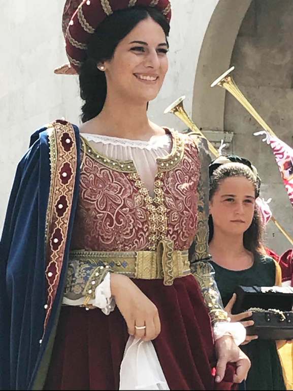 Il suo vestito, infatti, è stato eseguito da una sarta comasca, Celeste Costanza residente a Maslianico, che sottolinea quanta cura e attenzione ha messo nella realizzazione di ogni particolare filologico del costume medievale.