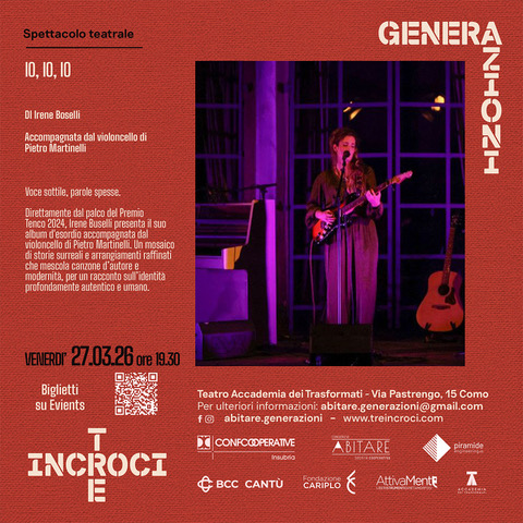 Venerdì 27 marzo 2026, alle 19:30, al Teatro Accademia dei Trasformati (Via Pastrengo, 15, Como), va in scena Io, io, io – LIVE. Il concerto di Irene Buselli è il prossimo appuntamento della rassegna teatrale Gener-Azioni 2025-26, organizzata da Confcooperative Insubria, Consorzio Abitare e Piramide Engineering, con la direzione artistica di AttivaMente e il contributo di BCC Cantù e Fondazione Cariplo.