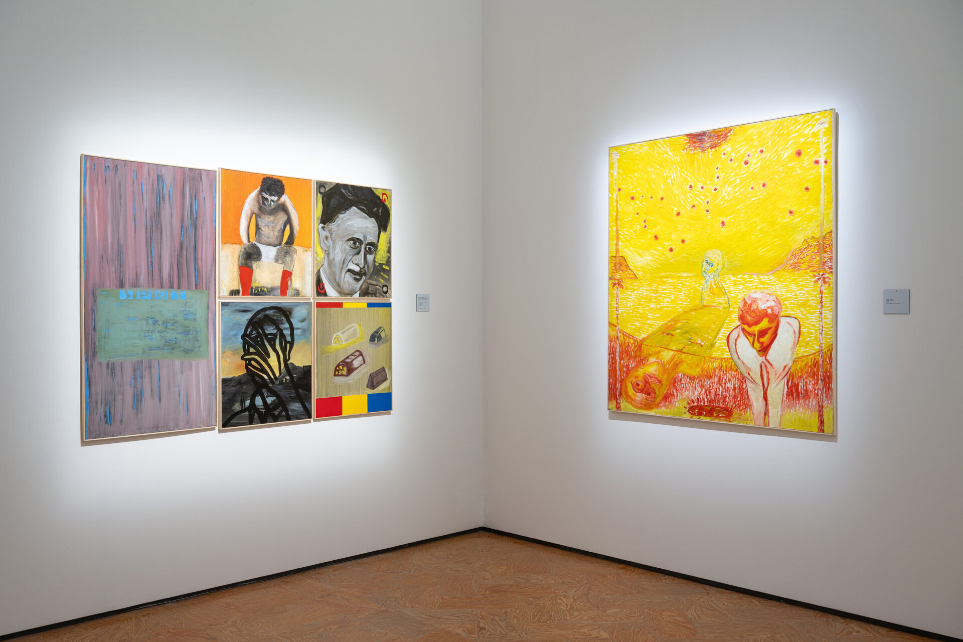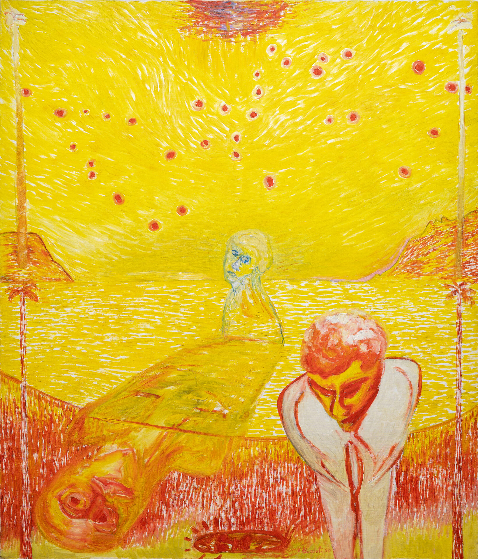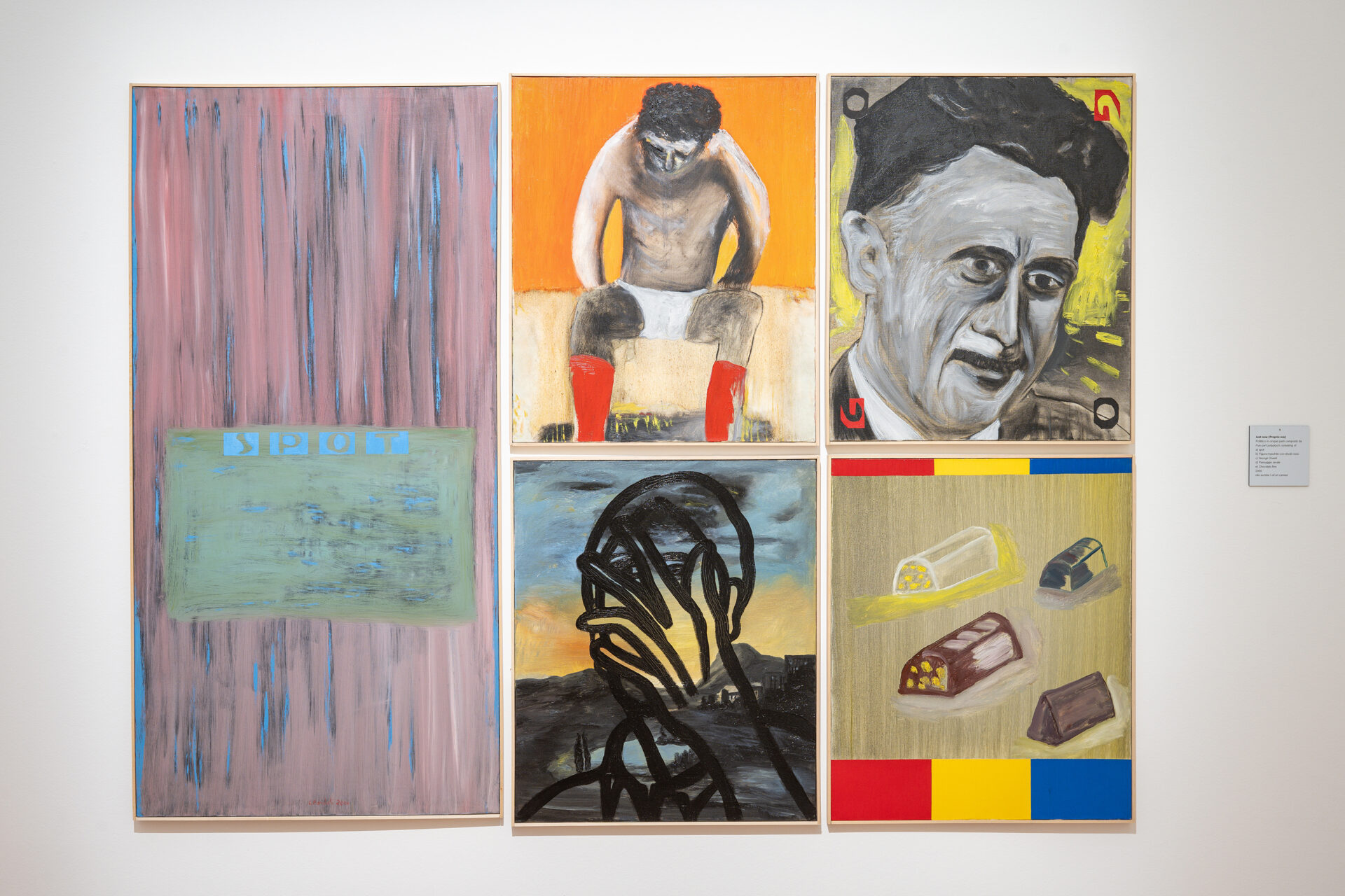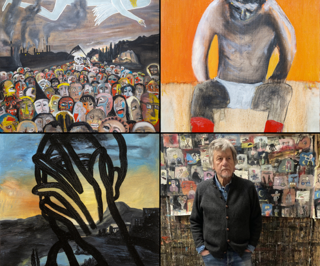 L’esposizione presenta tre lavori donati dall’artista al Comune di Como nel 2025 – Cielo stellato (1990), Just now (2000, polittico in cinque parti) e La morte tra la gente (2020) – oggi parte delle collezioni civiche. Le opere attraversano oltre trent’anni di ricerca: dal paesaggio lacustre trasfigurato in chiave onirica di Cielo stellato, alla costruzione modulare e simbolica di Just now, fino alla forte tensione emotiva e al senso di fragilità evocati in La morte tra la gente, realizzata durante la pandemia.