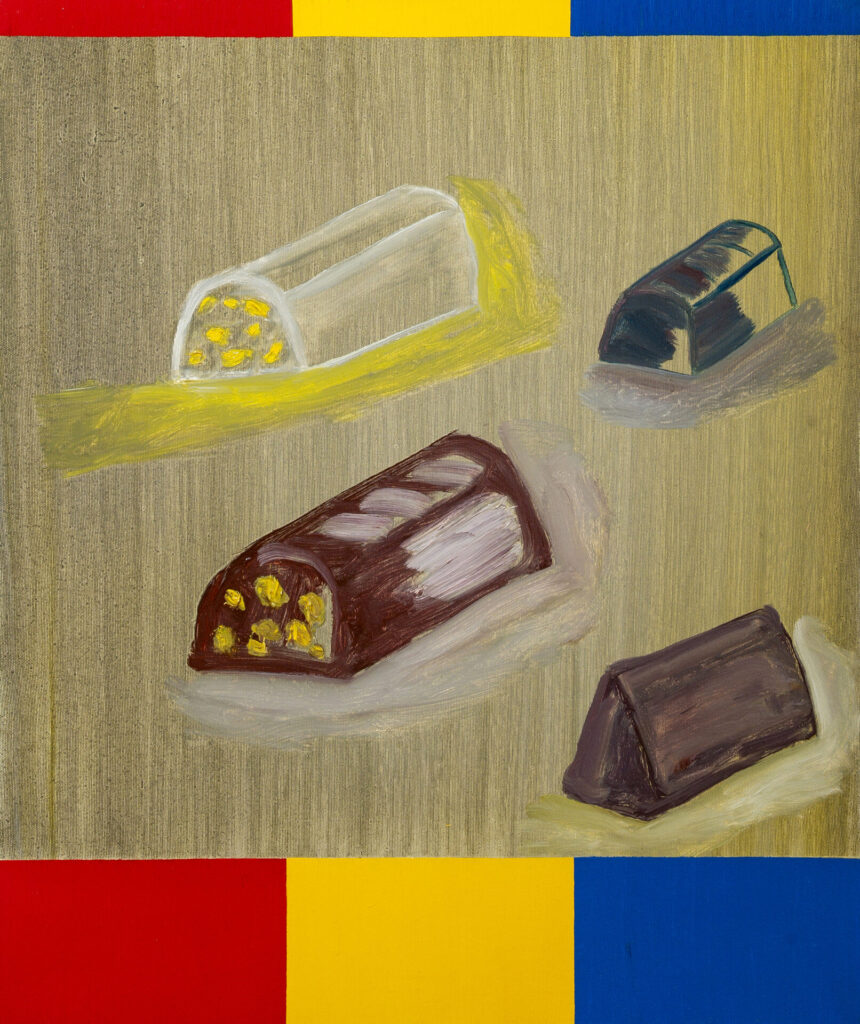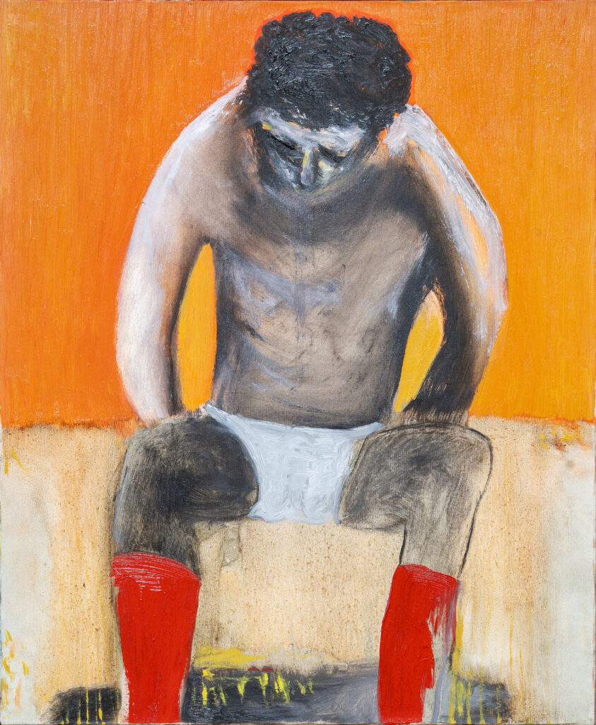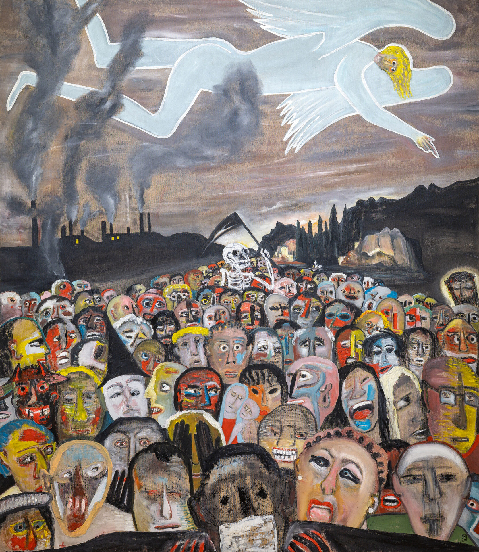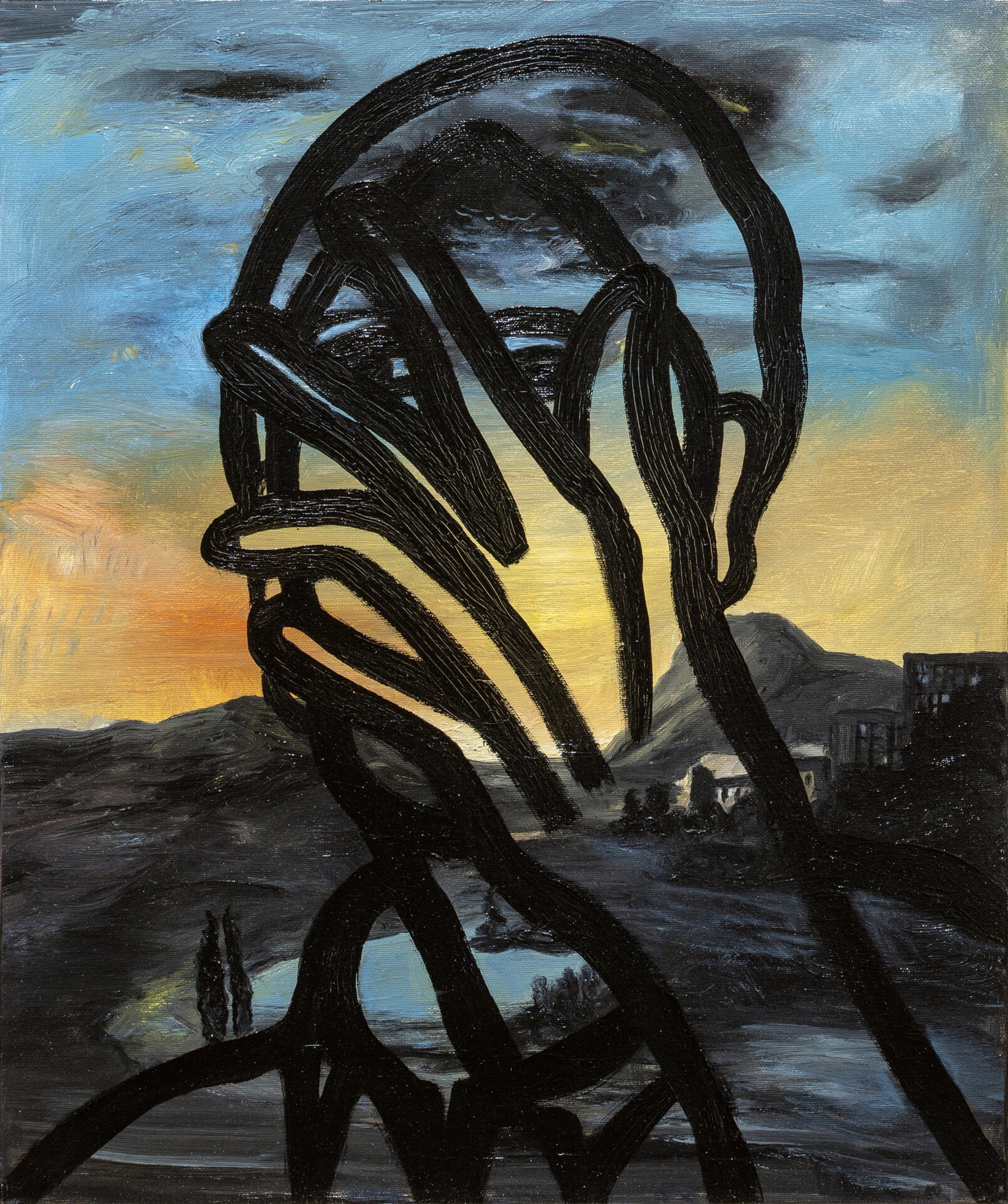 L’esposizione presenta tre lavori donati dall’artista al Comune di Como nel 2025 – Cielo stellato (1990), Just now (2000, polittico in cinque parti) e La morte tra la gente (2020) – oggi parte delle collezioni civiche. Le opere attraversano oltre trent’anni di ricerca: dal paesaggio lacustre trasfigurato in chiave onirica di Cielo stellato, alla costruzione modulare e simbolica di Just now, fino alla forte tensione emotiva e al senso di fragilità evocati in La morte tra la gente, realizzata durante la pandemia.