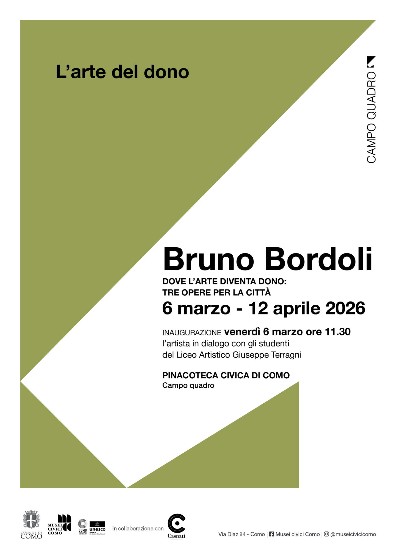 È stata prorogata fino al 3 maggio 2026 alla Pinacoteca Civica di Como la mostra “Bruno Bordoli. Dove l’arte diventa dono: tre opere per la città”, inizialmente prevista fino al 12 aprile.