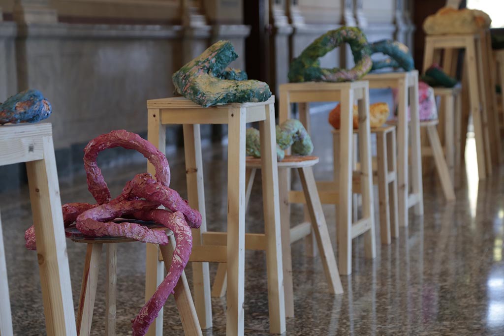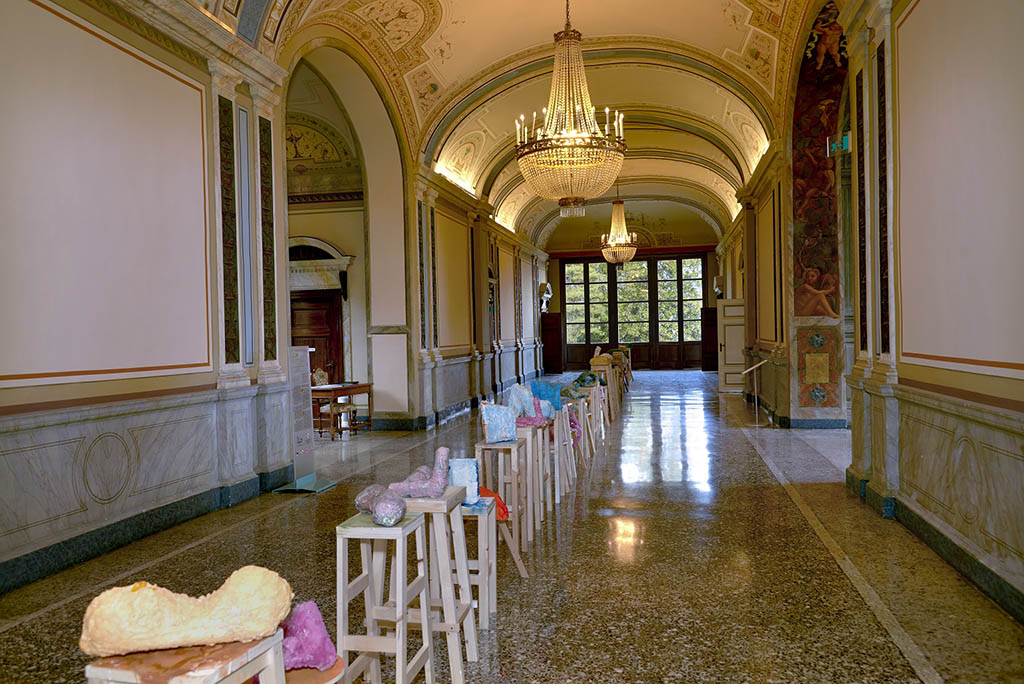 Il parco della villa sarà infine animato da presenze cromatiche volte a creare una sorta di percorso in cui delle liane colorate si arrampicheranno sugli alberi, strisceranno sui prati fino ad arrivare al famoso tronco di duglasia, rimasto ancora intatto nella sua potenza anche se adagiato orizzontalmente sul prato.