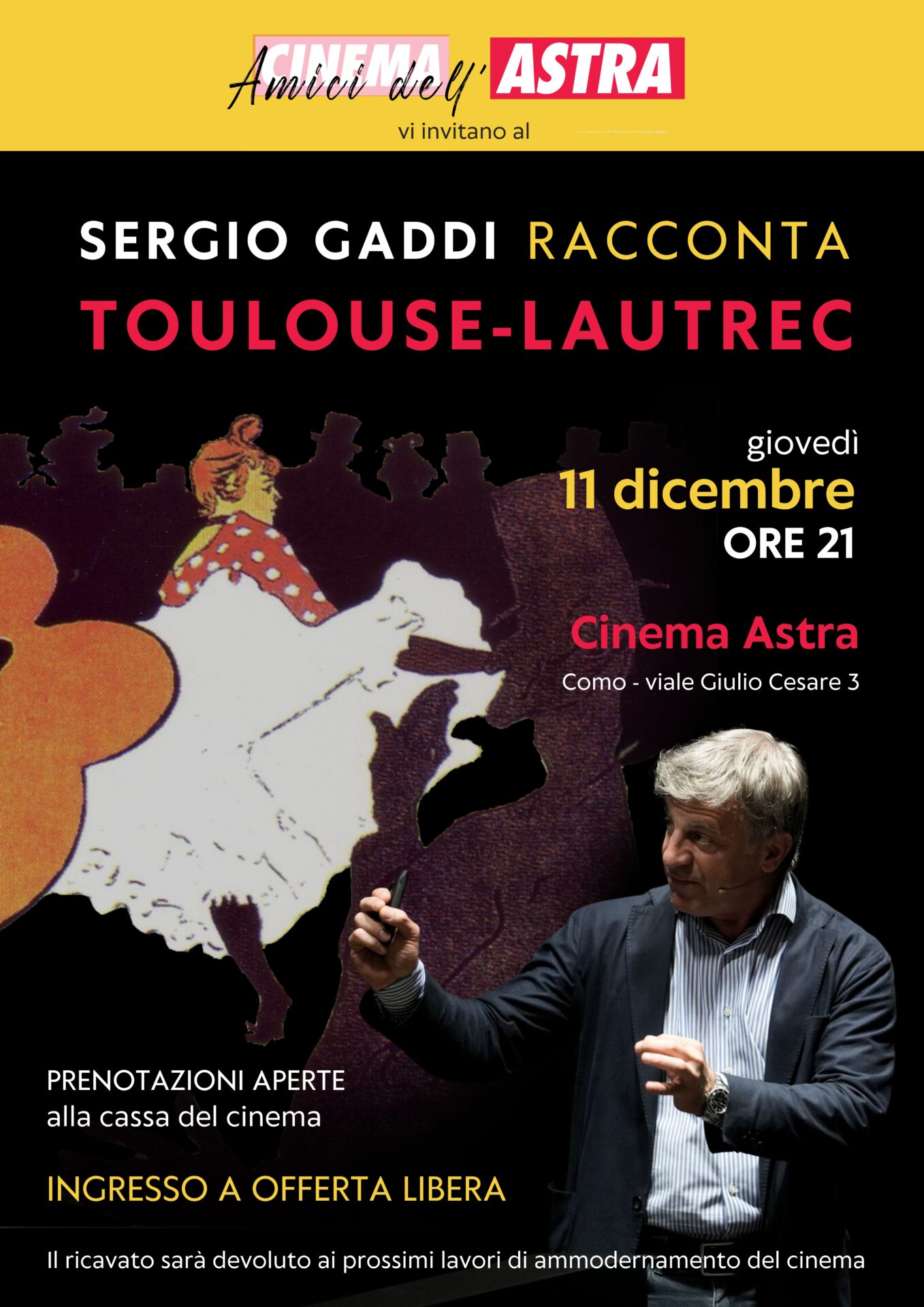 “Sergio Gaddi racconta Henri de Toulouse-Lautrec” sarà un vero e proprio viaggio attraverso contesto storico, vicende personali e opere dell’artista, con l’ausilio di musiche e filmati che renderanno la storia dell’arte un concentrato di emozioni e conoscenza.