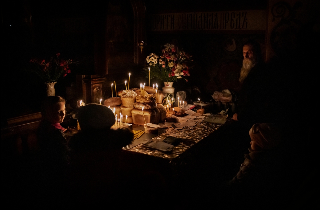 - Ucranian kids around a table full of cakes, during an Ortodox mass. Manu Brabo