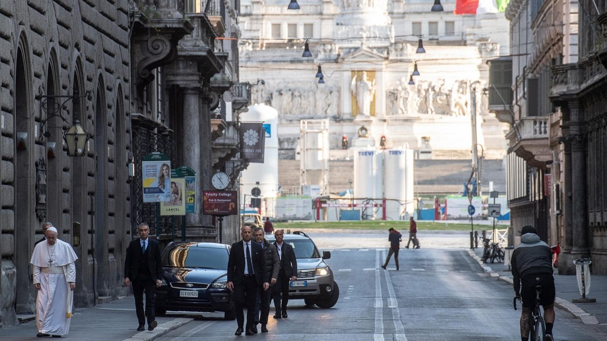 - Santo Padre che cammina per Roma deserta durante il primo lockdown. Fotografo della Santa Sede