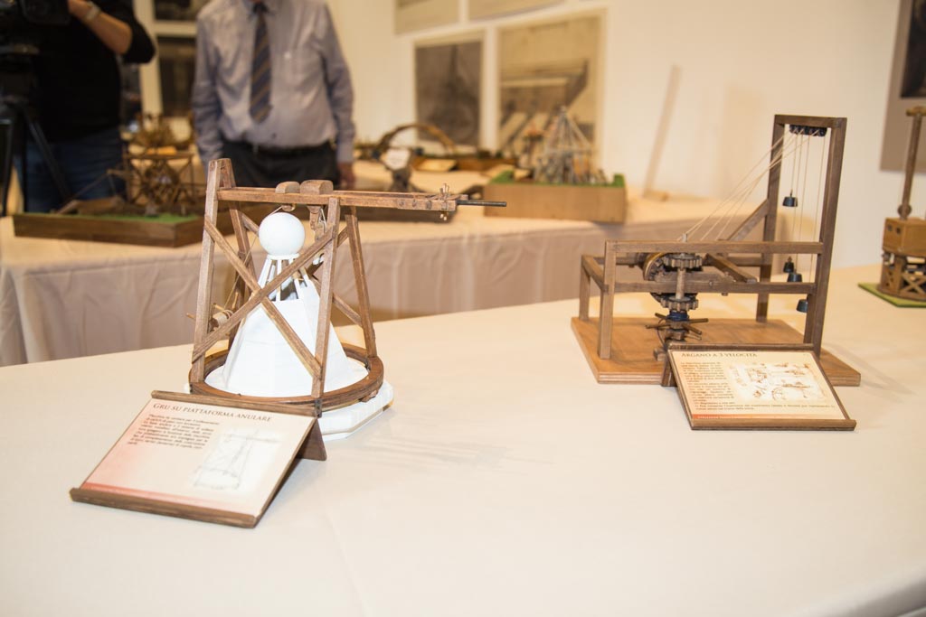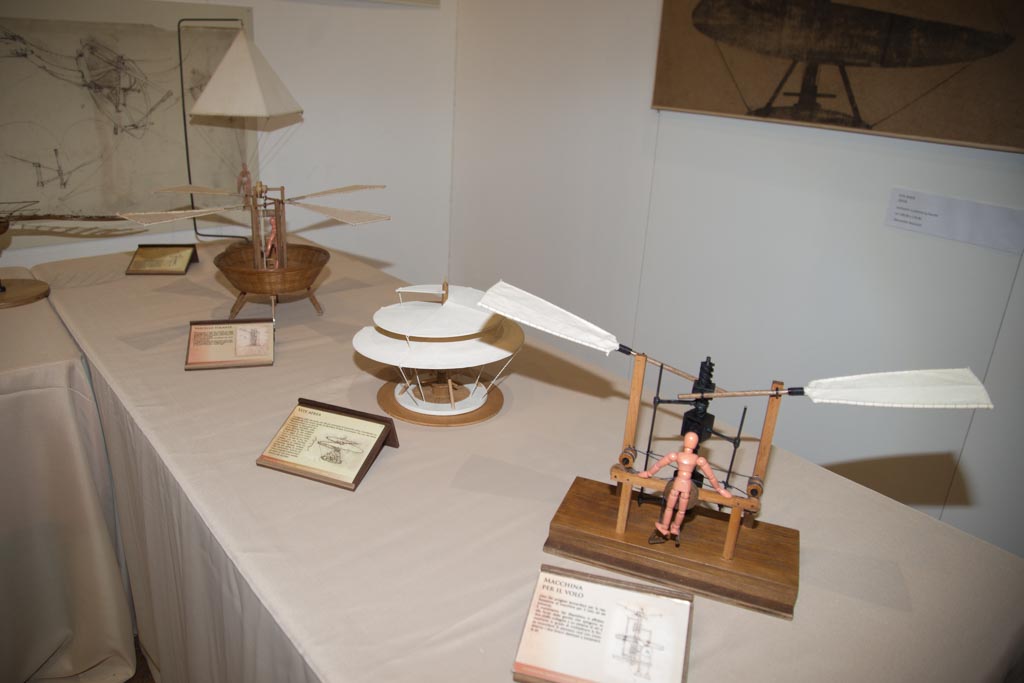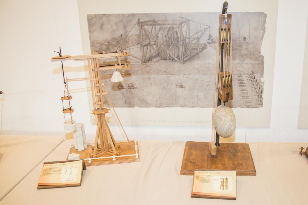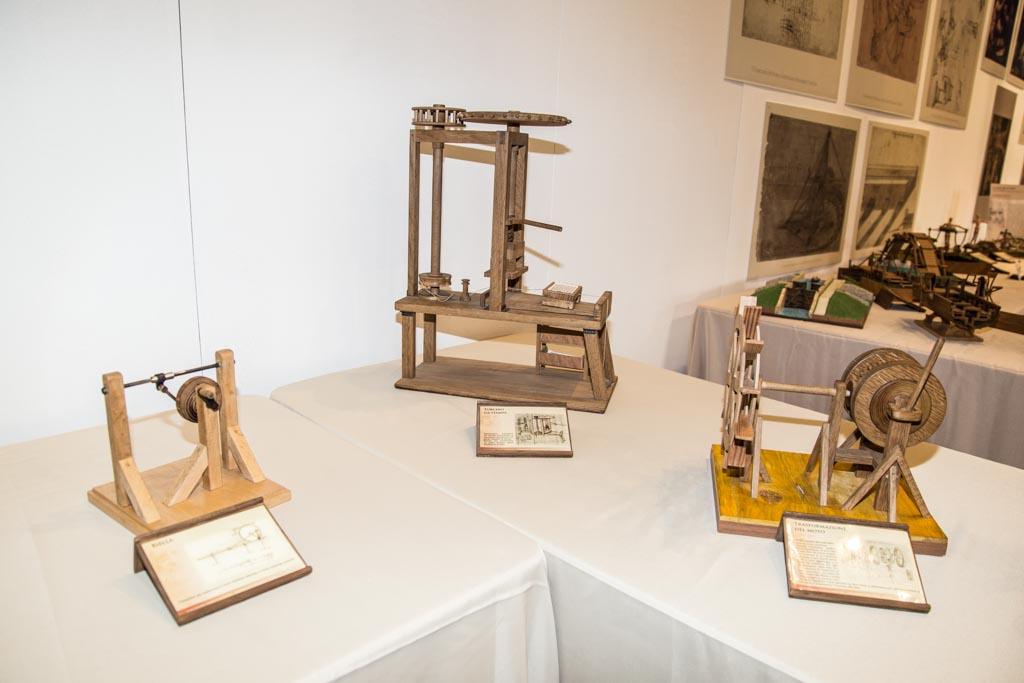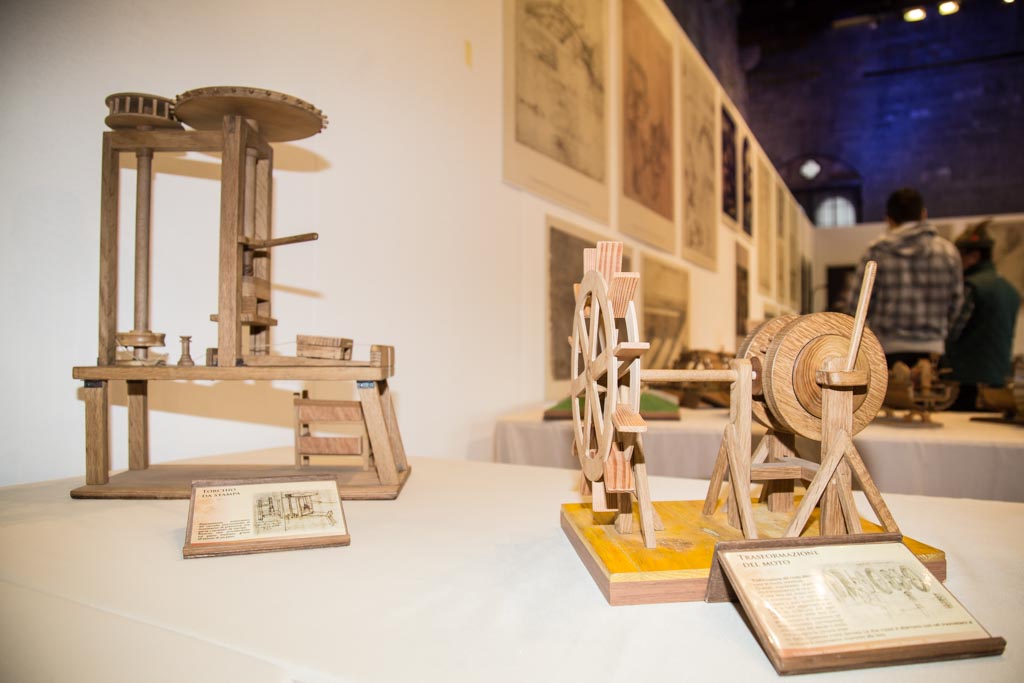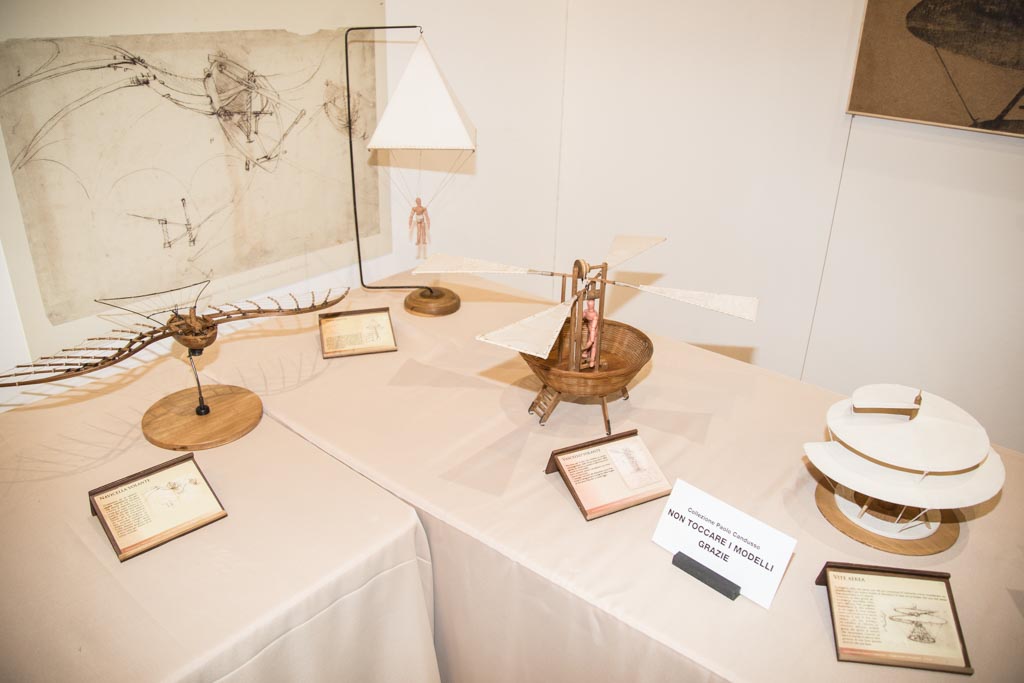 In esposizione, quasi 100 macchine in scala 1:72, tutte in legno e perfettamente funzionanti, realizzate con rigorosa interpretazione dei disegni di Leonardo da Vinci da Paolo Candusso, meccanico in pensione appassionato di modellistica.