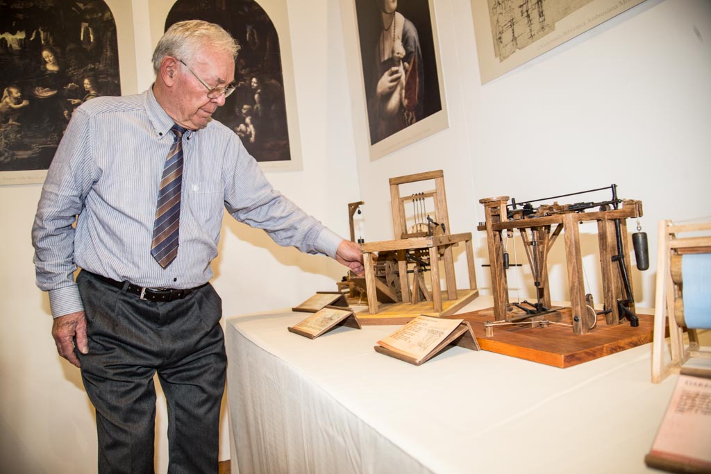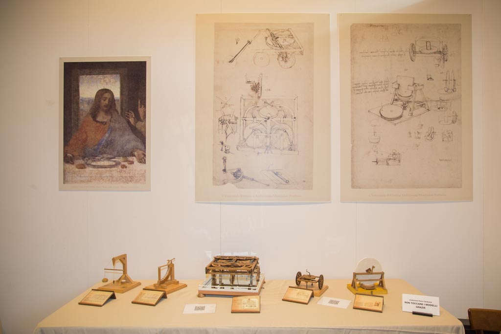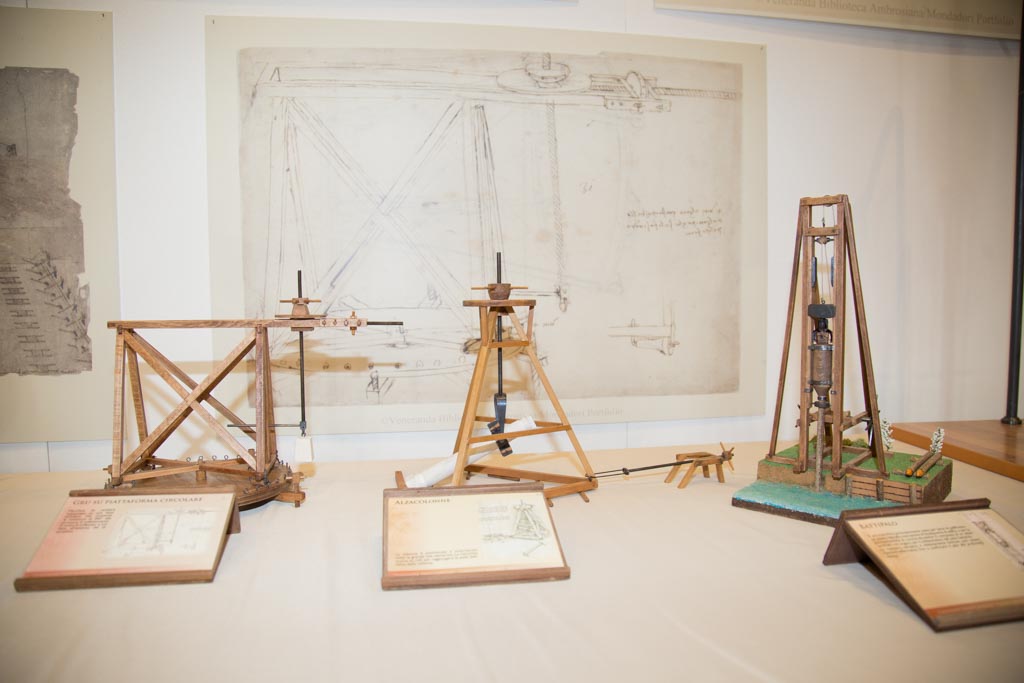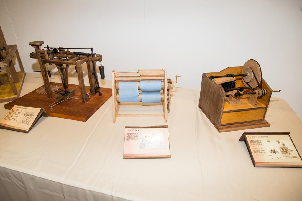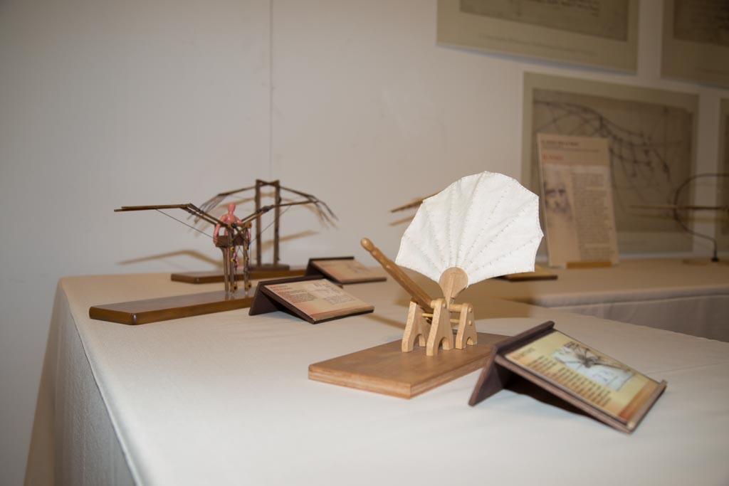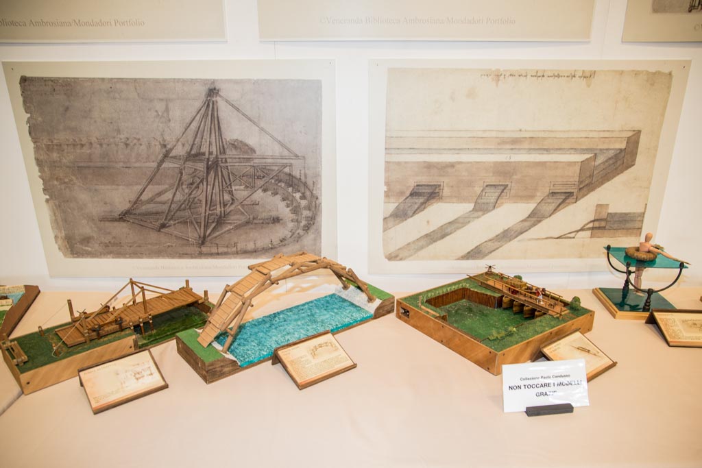 In esposizione, quasi 100 macchine in scala 1:72, tutte in legno e perfettamente funzionanti, realizzate con rigorosa interpretazione dei disegni di Leonardo da Vinci da Paolo Candusso, meccanico in pensione appassionato di modellistica.