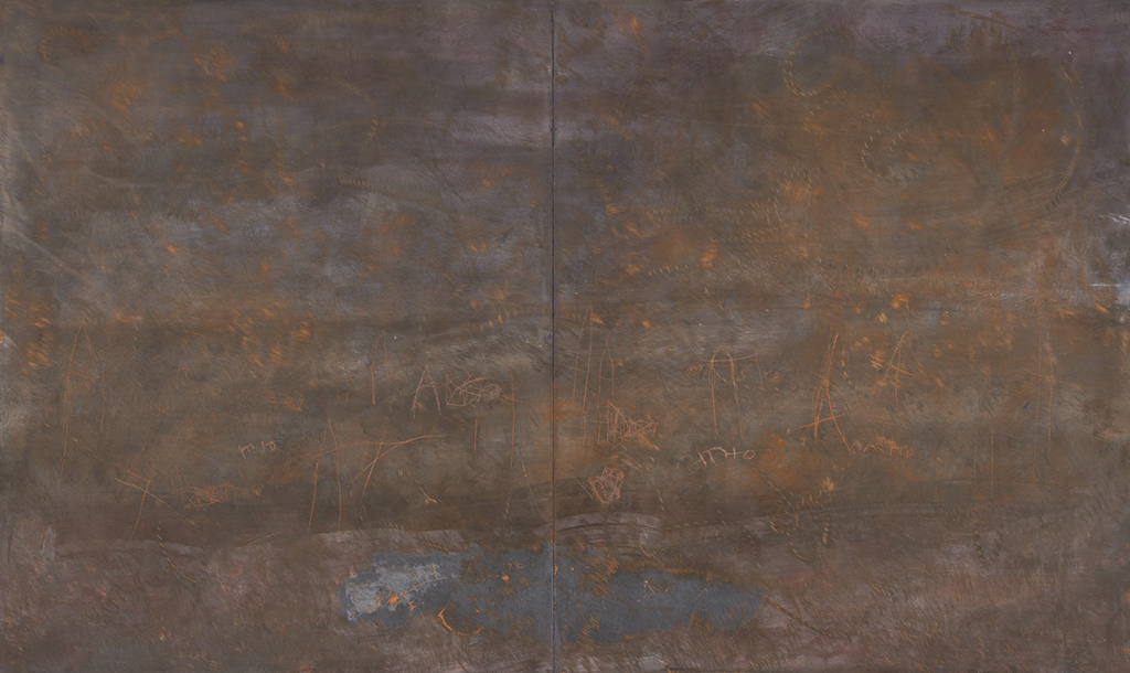 L’impulso espressionista di questi lavori si placa progressivamente nel corso degli anni Novanta; le colature e le sovrapposizioni di colori si attenuano, si assottigliano, si stemperano arrivando a realizzare campiture quasi monocrome di colore bianco, ruggine e blu grigio – il tutto con un’azione ridotta ai minimi termini, vicina al grado zero.