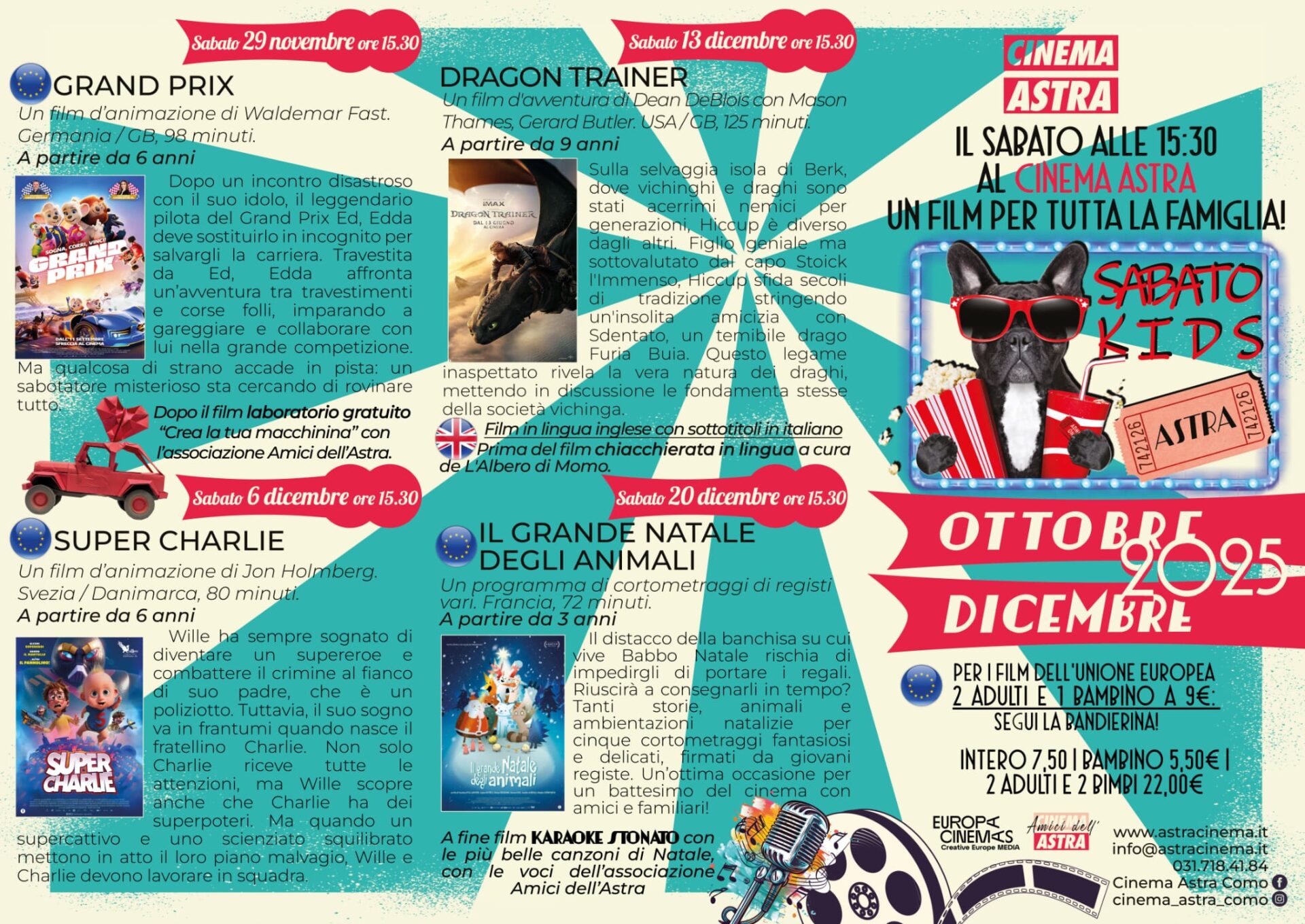 I prezzi rimangono invariati con il biglietto under 12 a 5,50 € e la speciale tariffa Family (2 adulti e 2 bambini) a 22 €, a cui si aggiunge una tariffa speciale per tutti i film europei: 2 adulti e 1 bambino a soli 9 €! I film che rientrano in questa iniziativa sono contrassegnati dalla bandierina dell’Unione Europea sul volantino Sabato Kids disponibile al cinema o online su astracinema.it.