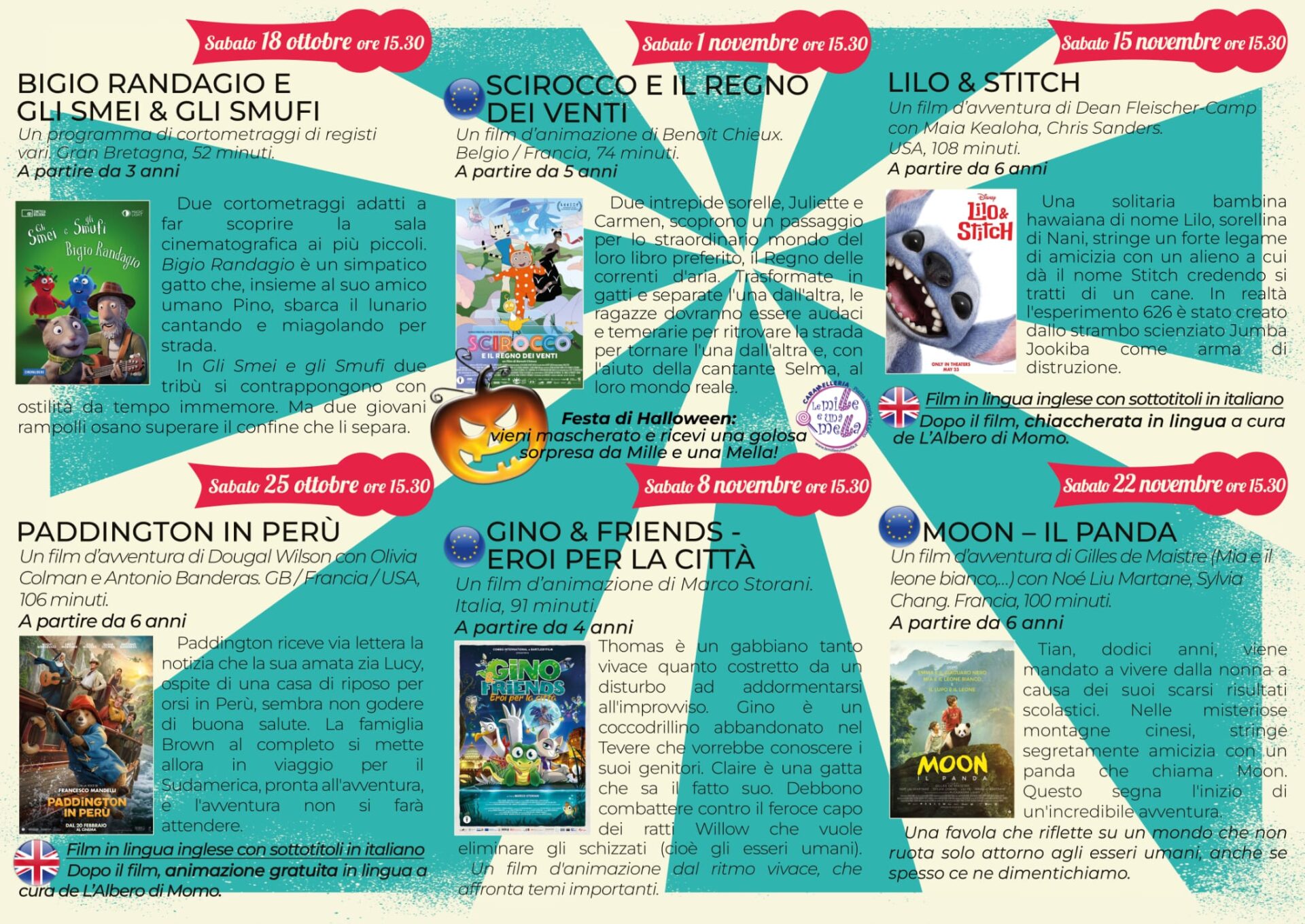 Una delle novità riguarda infatti i laboratori abbinati ai film: grazie alla scuola di inglese L’Albero di Momo gli appuntamenti in lingua saranno ben tre (PADDINGTON IN PERU’ il 25 ottobre; LILO & STITCH il 15 novembre; DRAGON TRAINER il 13 dicembre), tutti in versione originale con sottotitoli in italiano, seguiti da animazioni gratuite proprio a cura delle insegnanti della scuola.