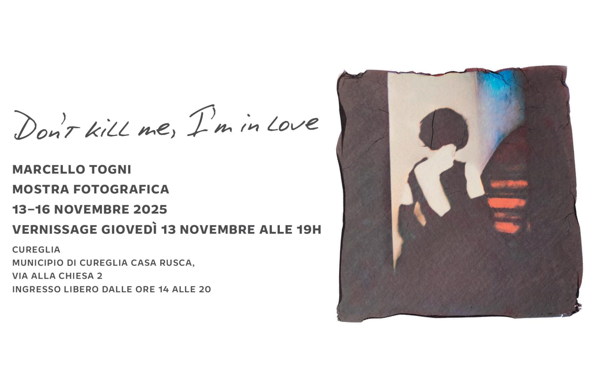 Un titolo che suona come un grido e una dichiarazione al tempo stesso: Don’t kill me, I’m in love. È questo il titolo della nuova breve ma intensa mostra di Marcello Togni, artista svizzero che vive a Parigi, in programma a Cureglia (Canton Ticino, distretto di Lugano) presso il Municipio – Casa Rusca (Via alla Chiesa 2) dal 13 al 16 novembre 2025.