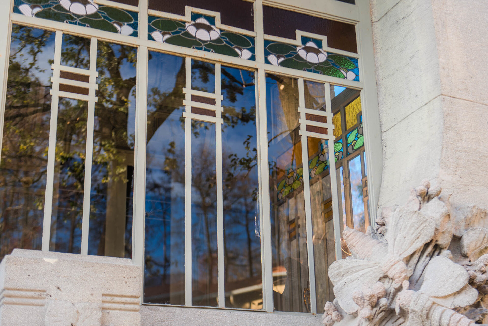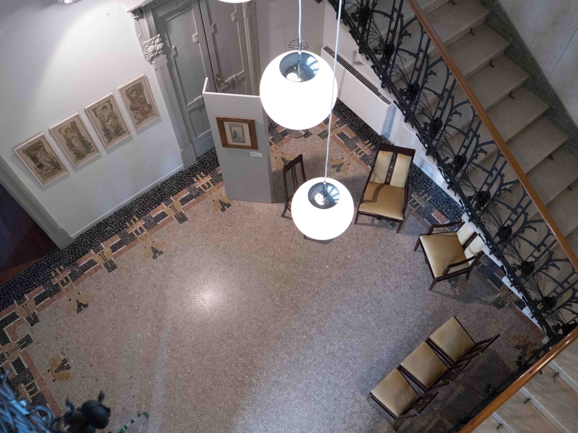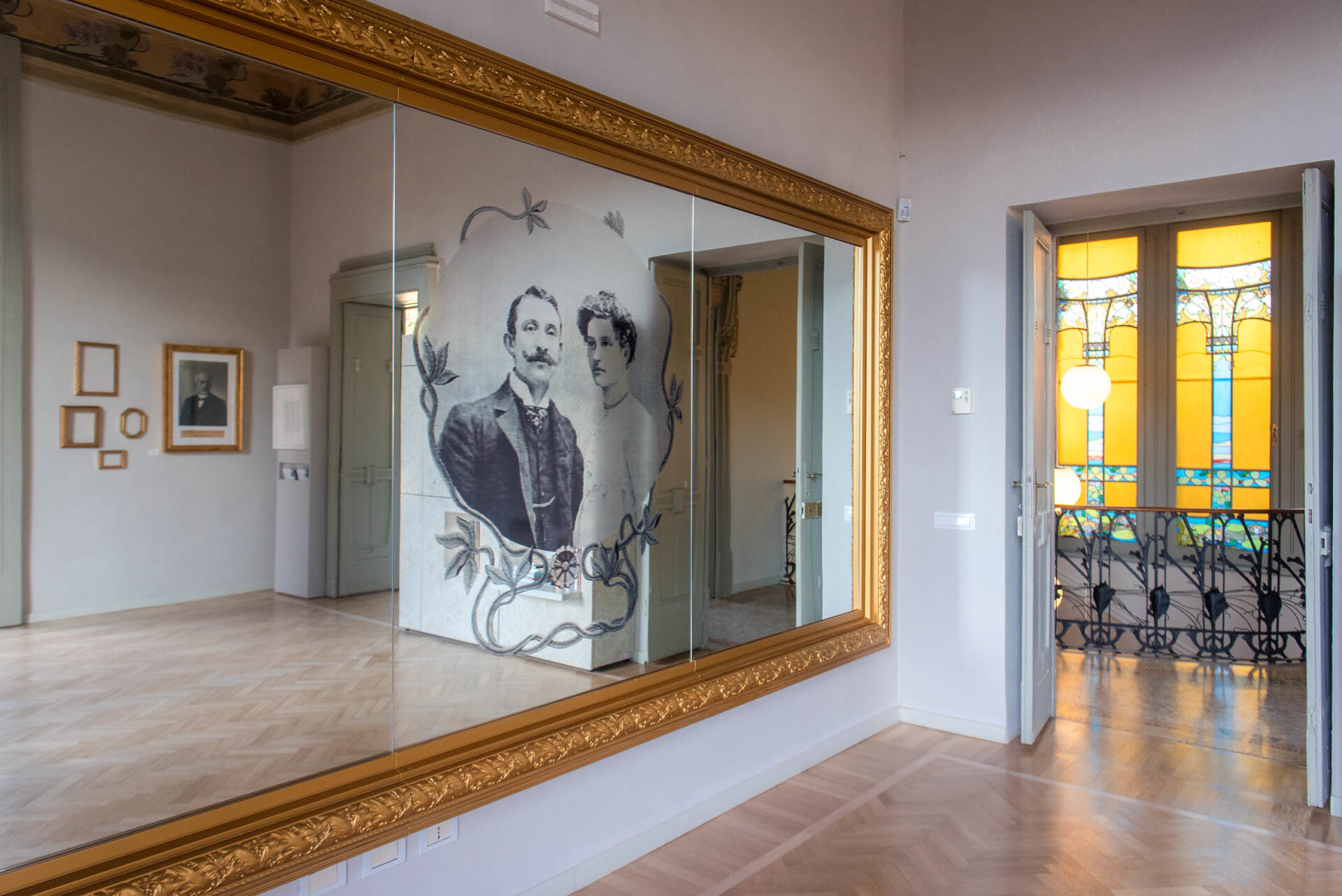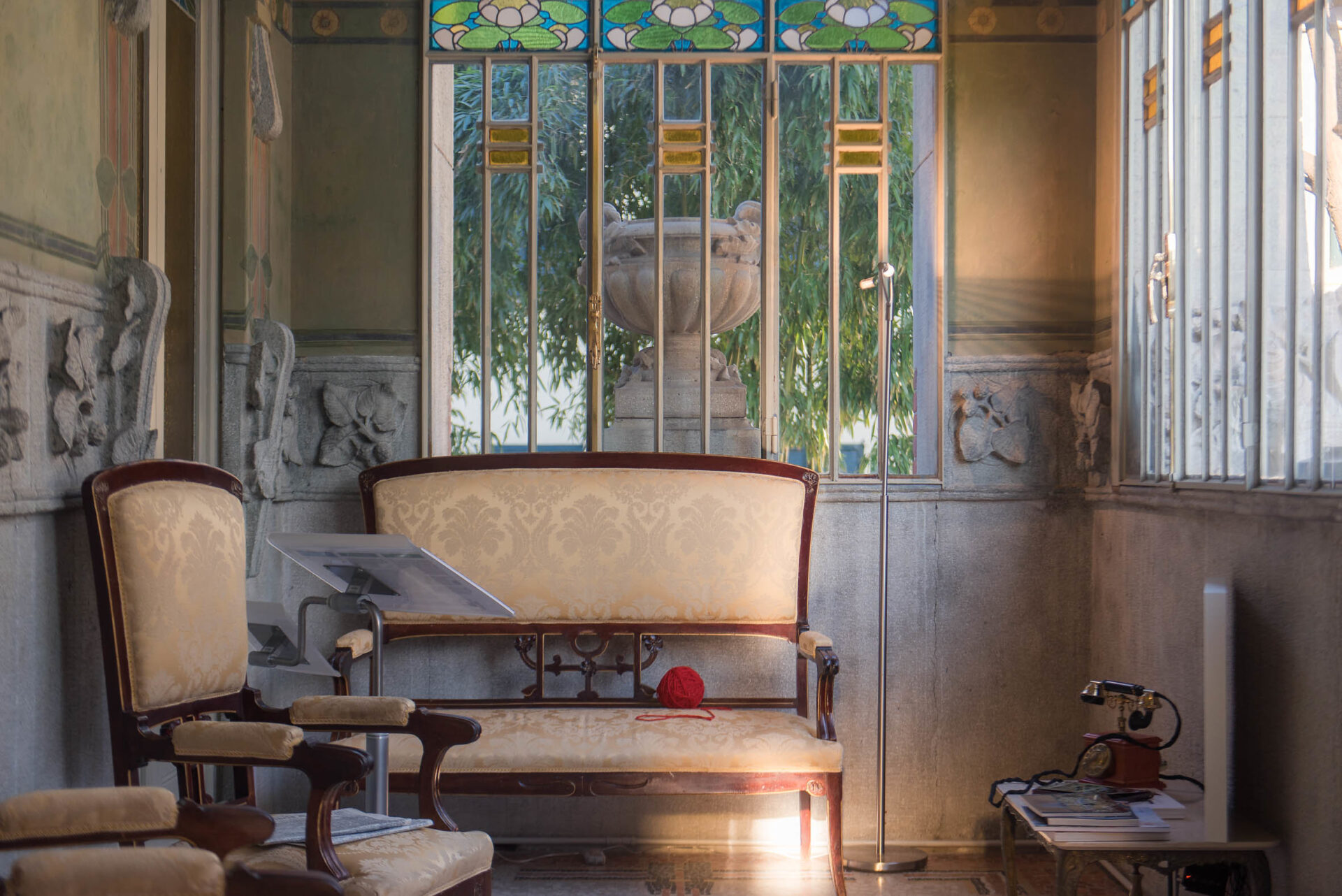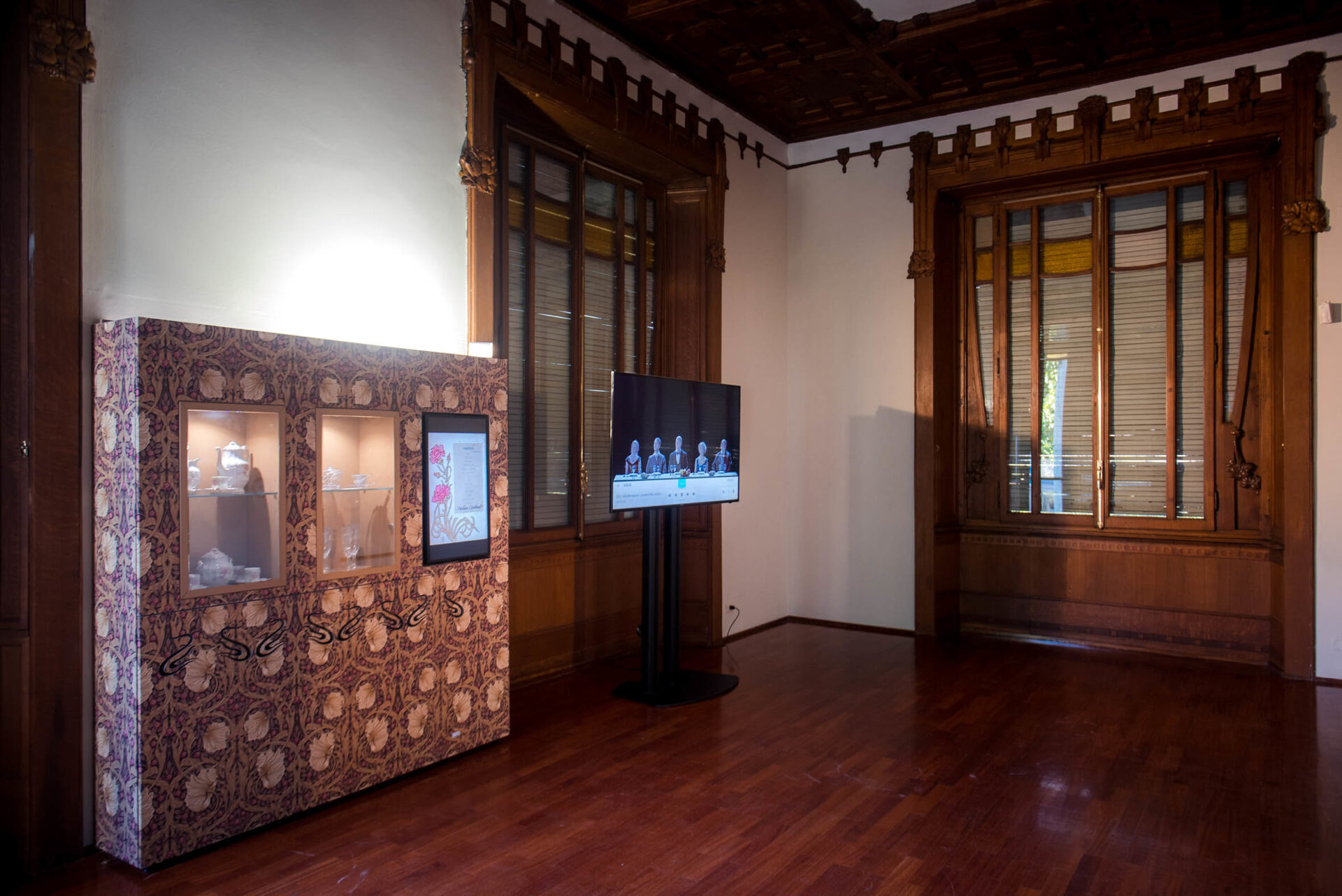 Infine, è dell’ebanista Eugenio Quarti (1867 –1926) il salottino in legno di mogano presentato ai piedi dello scalone di Villa Bernasconi, dove le linee eleganti degli alti schienali delle sedie paiono dialogare con i ferri della ringhiera di Alessandro Mazzucotelli (1865 – 1938). I due furono amici in vita, viaggiarono insieme in Europa, parteciparono alle più importanti esposizioni e lavorarono con i più noti architetti esponenti del Liberty, compreso l’architetto Alfredo Campanini (1873-1926), progettista di Villa Bernasconi. È parso, dunque, interessante ristabilire una connessione in occasione di questo – seppur temporaneo – allestimento, immaginando come doveva essere la casa a inizio Novecento.