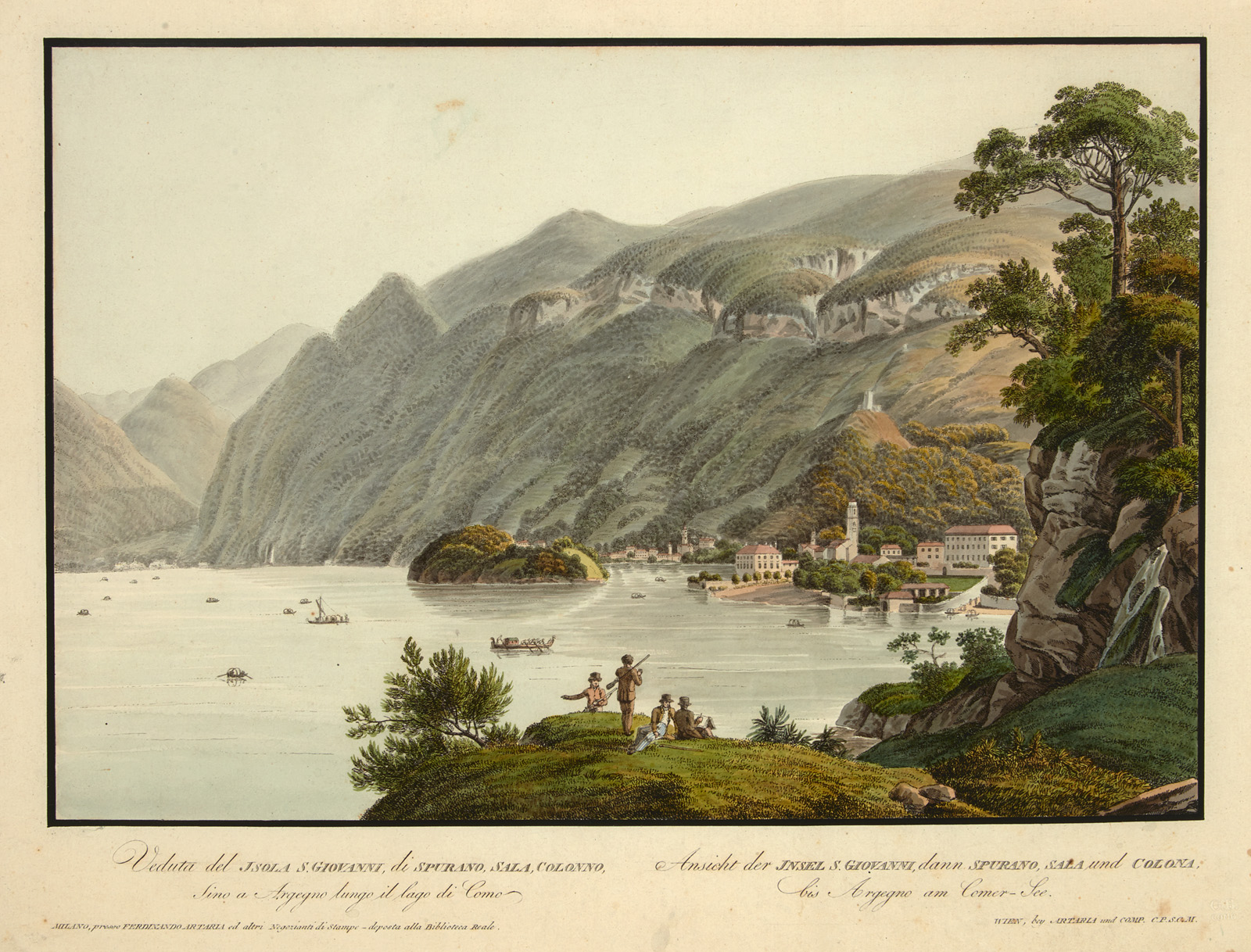1)Veduta delL’Isola S. Giovanni, di Spurano, Sala, Colonno, sino a Argegno lungo il lago di Como Artaria & C. edit. Ferdinando Artaria (1781-1843) Incisione in rame al tratto 1815 ca 271×402 mm