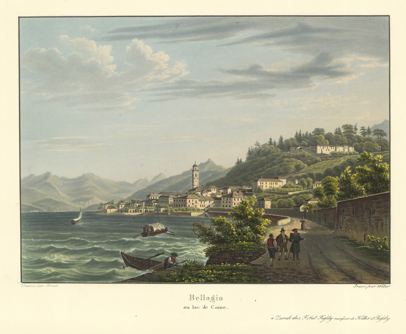 Bellagio au lac de Come Salomon Corrodi (1810-1892) dis. Weber inc. F. Sal. Fussly edit. Acquatinta 1830 ca 176×243 mm