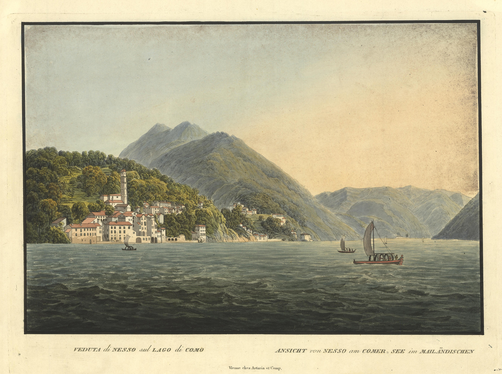 Veduta di Nesso sul lago di Como Artaria & C. edit. Incisione in rame al tratto 1815 ca 282×414 mm