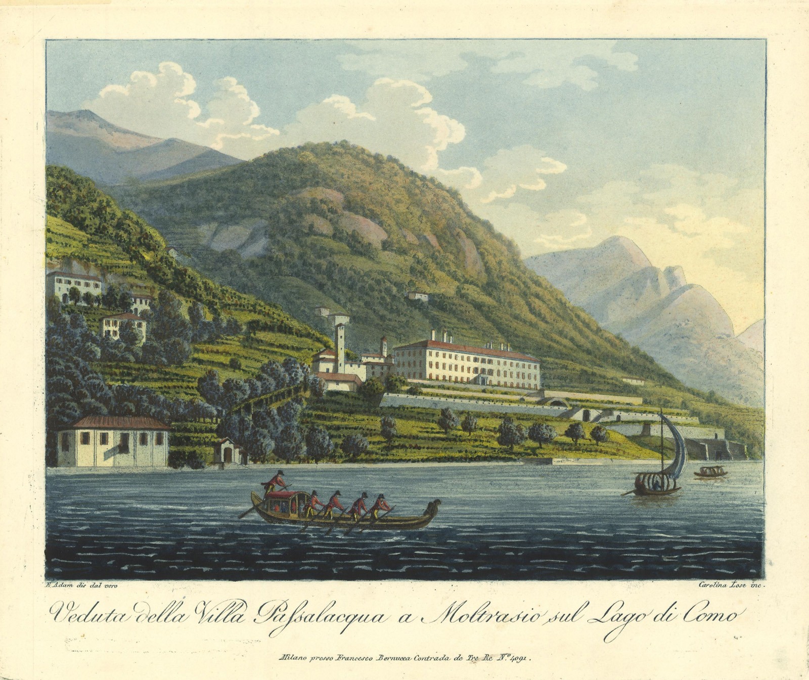 Veduta della Villa Passalacqua a Moltrasio sul Lago di Como E. Adam dis. Carolina Lose (1784-1837) inc. Francesco Bernucca (1777-1825) edit. Acquatinta 1820 ca 157×209 mm