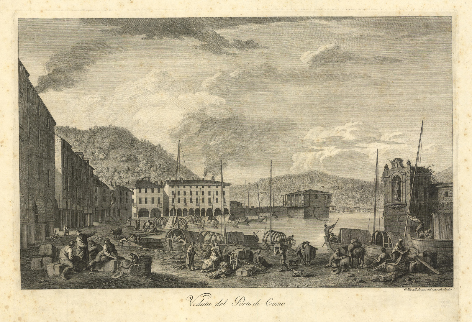 Porto di Como Girolamo Mantelli (attivo fine ‘700) dis. ed inc. Incisione in rame Fine ‘700 254×405 mm