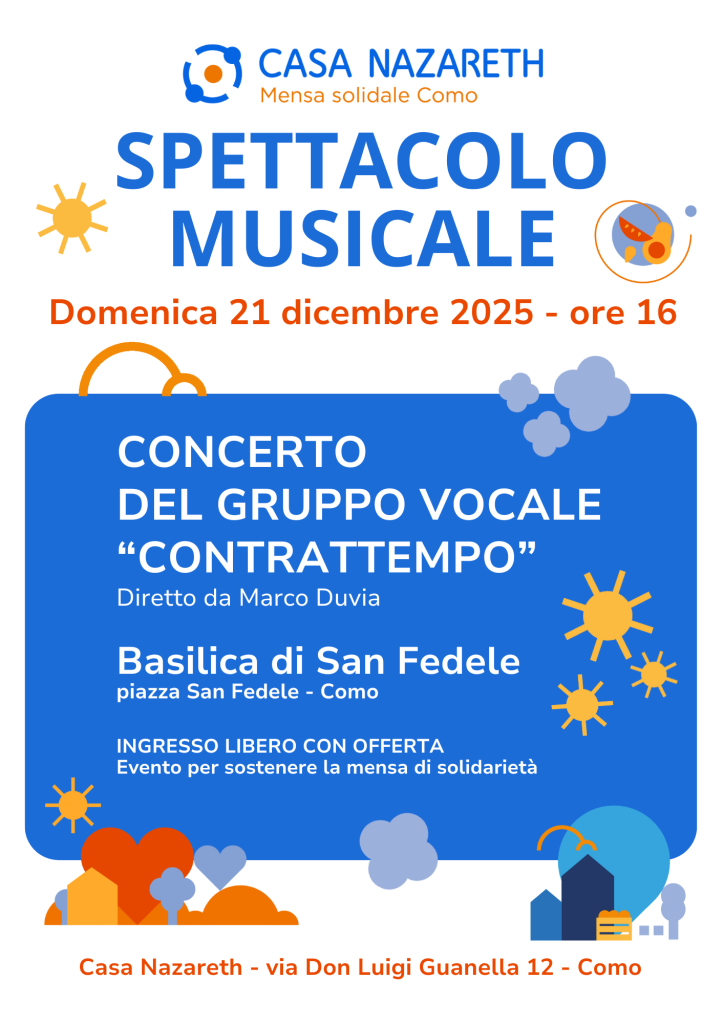 Questo concerto rientra nel ricco programma di appuntamenti che gli enti promotori di Casa Nazareth organizzano ogni anno per far conoscere e sostenere la mensa di solidarietà di via Don Luigi Guanella 12 ed è uno dei momenti conclusivi della Campagna natalizia denominata “A tavola c’è un pasto per tutti. Anche a Natale! – Bastano 4 euro per donare un pasto a chi ne ha bisogno”.